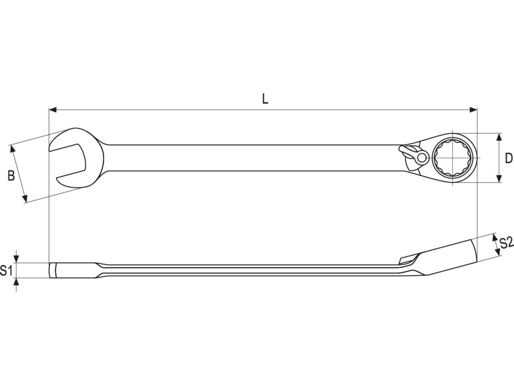 Očkoplochý klíč s dvanáctihranným profilem opatřeným ráčnou s jemným 72 zubým chodem a přepínačem levého/pravého chodu.
