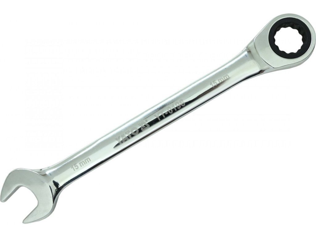 Ráčnový očkoplochý klíč Yato - na jedné straně klasický stranový klíč, na straně druhé očkový klíč s dvanáctihranným profilem vybaveným ráčnou s jemným dělením 72 zubů. Tělo klíče je vyrobeno z chromvanadiové oceli CrV6140. Povrch je vyleštěn do vysokého lesku.