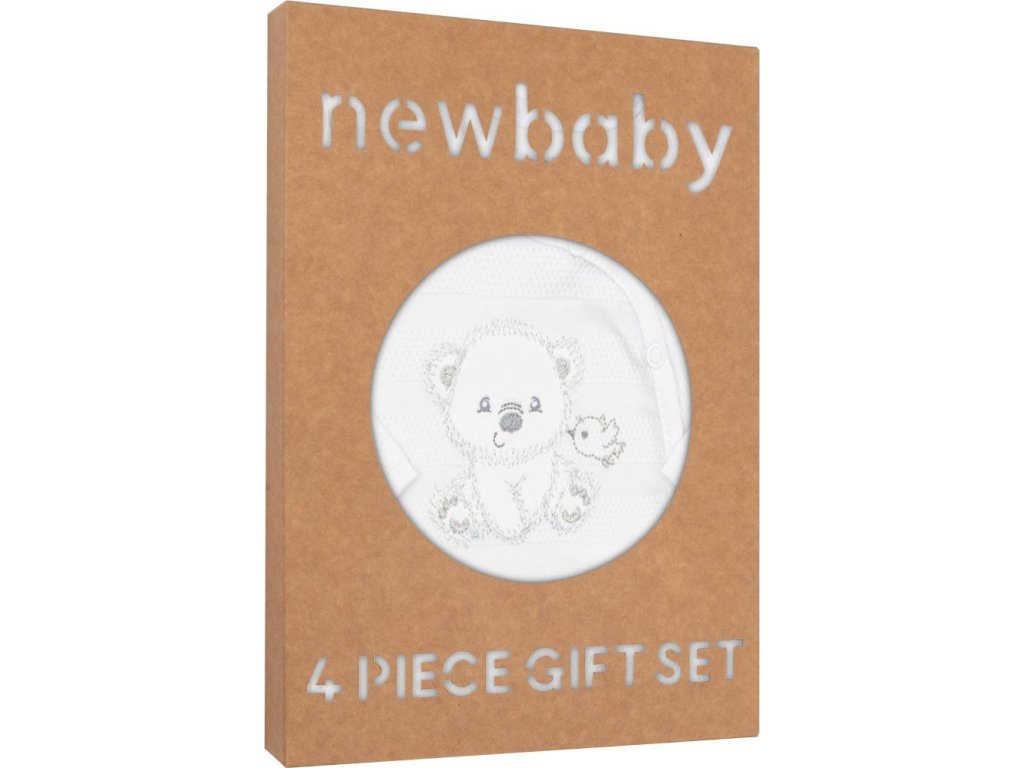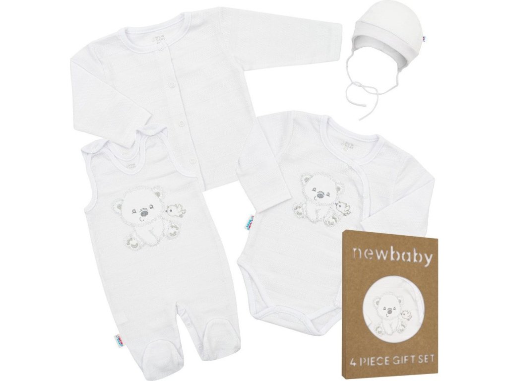 4-dílná soupravička české značky New Baby Sweet Bear pro miminka. Soupravička je vyrobena z kvalitního materiálu, který je vhodný pro miminka a je vhodná nejen do porodnice. Obsahuje celorozepínací body s dlouhým rukávkem, dupačky, kabátek a čepičku. Celorozepínací body zdobí vyšitý obrázek medvídka a ptáčka. Dupačky zdobí roztomilý obrázek medvídka a ptáčka. Zapínání na cvočky na ramínkách a mezi nožičkami. Kabátek je jednobarevný s krásným lemováním okolo ručiček. Zapínání je na cvočky po celé délce. Čepička je krásně tvarovaná na ouška a zavazuje se na tkaničky. Soupravička je v praktické Eko krabičce. Celá soupravička má nový neobyčejný design s atraktivním vzorem látky. Složení: 100% bavlna.