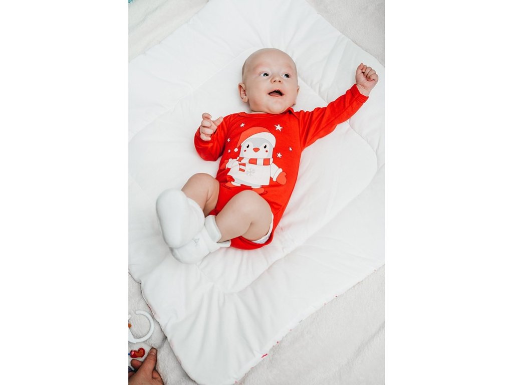 Kojenecké body s dlouhým rukávem New Baby Winter Penguin. Body je v krásné červené barvě a je zdobeno roztomilým a veselým tučňáčkem. Zapínání na cvočky na ramínku a mezi nožičkami usnadňuje oblékání a přebalování miminka. Naše body je vhodné pro kluky i holčičky a s roztomilým zimním motivem, budou při vánočním stromečku neodolatelné. Složení: 100% bavlna.