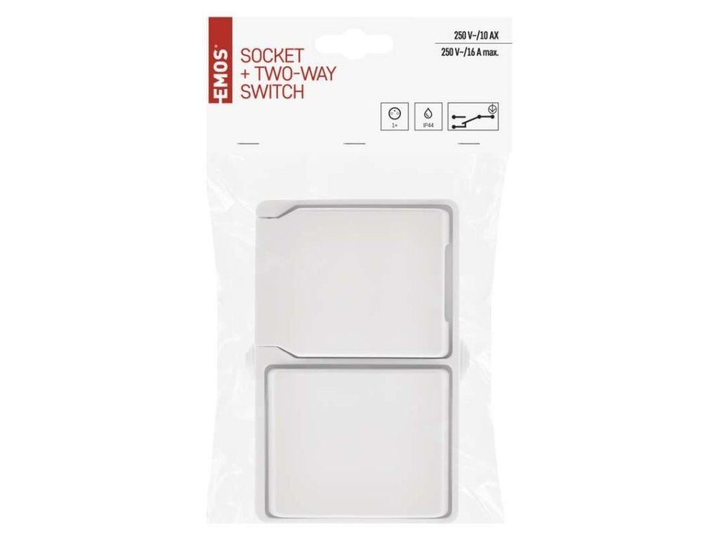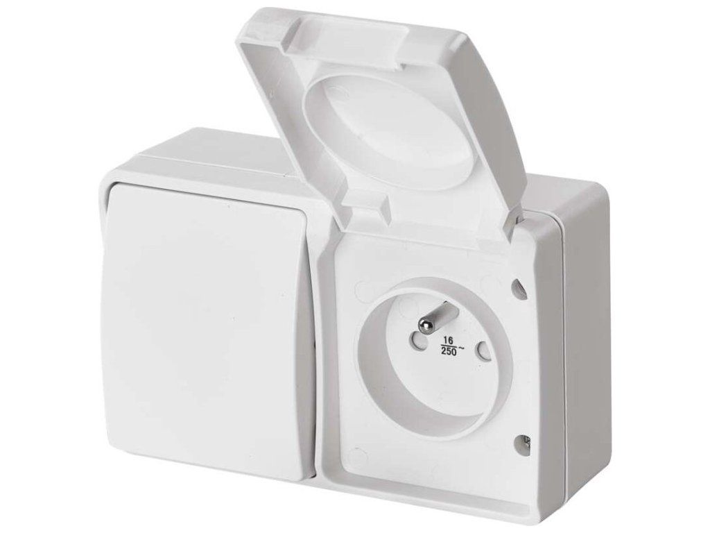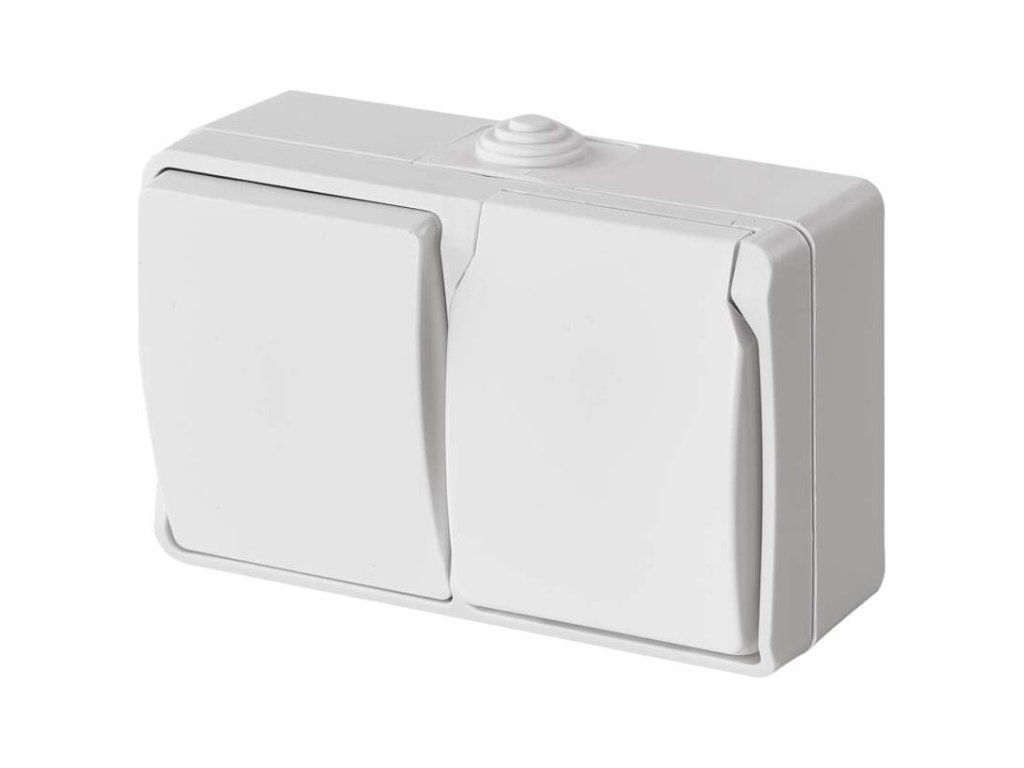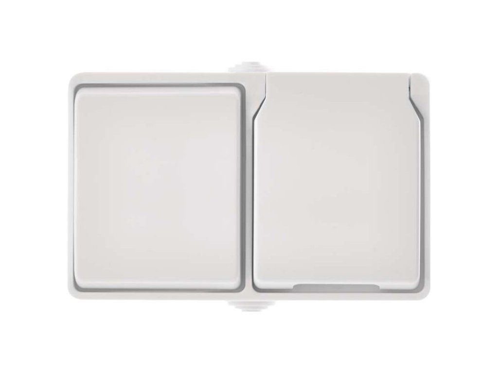Kombinace přepínače střídavého a zásuvky jednonásobné, voděodolné IP44. Horizontální montáž.