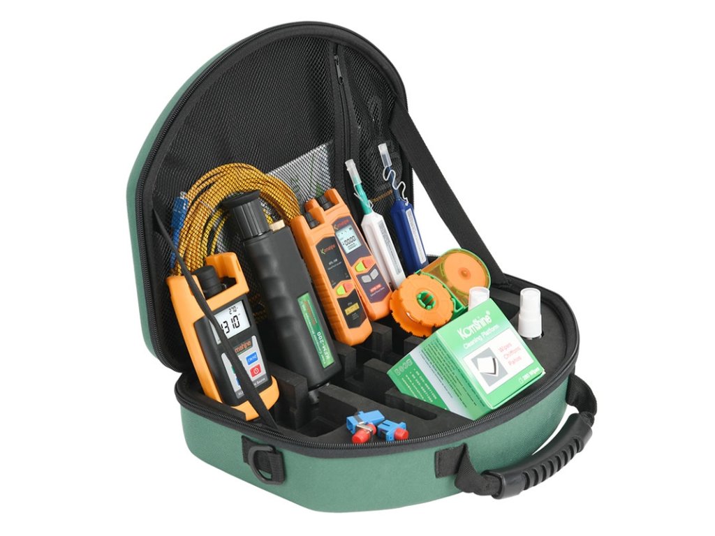 Sada nástrojů pro výstavbu optických sítí KLT-15D je profesionální sestava nářadí pro testování ztrát optických vláken a údržbu telekomunikačních systémů.