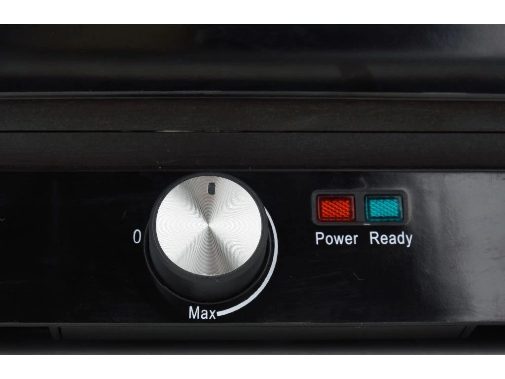 Možnost seřízení spodní a horní desky na výšku opékaného jídla. Kontaktní gril černé barvy s prvky z nerezové oceli si najde místo v každé kuchyni.