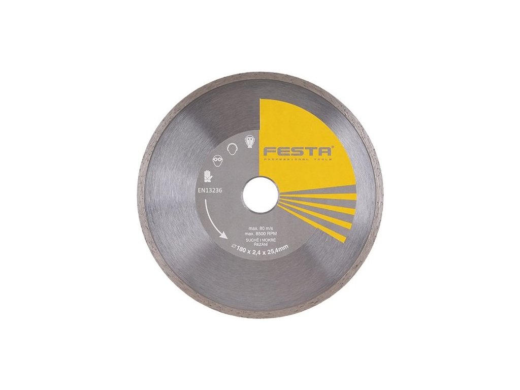 Profesionální diamantový kotouč FESTA, provedení : PLNÝ - celoobvodový, kvalitní diamantová vrstva s vysokým obsahem diamantového prachu, přesné zpracování - napojení na nosný disk kotouče odolávající vysokým teplotám, použití : určený pro mokré i suché řezání dlažby a obkladů, betonu, cihel, zdiva, žuly, mramoru, kamene, skla, keramiky, balení : blistr s eurootvorem, rozměry : uvedeny v názvu výrobku.