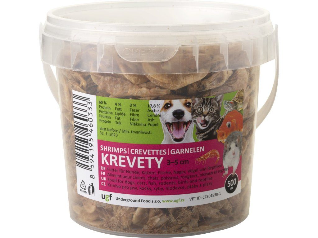 Krevety, sušené, 100% přírodní doplňkové krmivo určené pro psy, kočky, plazy, ryby (zejména KOI kapry), ptáky a hlodavce. Velikost krevet je 3–5 cm s obsahem vysoce kvalitní a lehce stravitelný protein (60 %), omega 3 nenasycené mastné kyseliny, vápník a vitaminy. Krevety mají důležitou roli ve výživě, protože díky nim mazlíčci doplní široké spektrum vysoce stravitelných živin, které jinak obtížně získávají (minerály, vitaminy, antioxidanty, aminokyseliny a mastné kyseliny). Jsou také velmi oblíbenou pochoutkou u mořských a suchozemských želv.