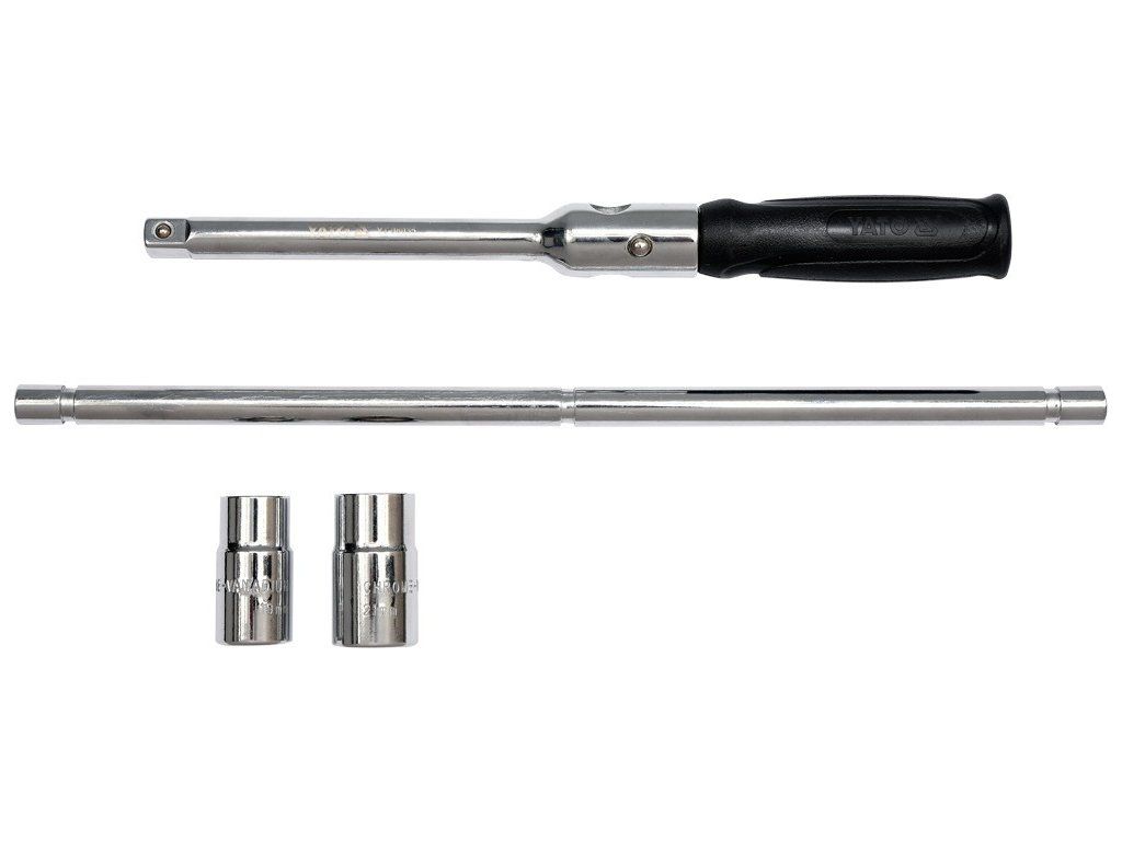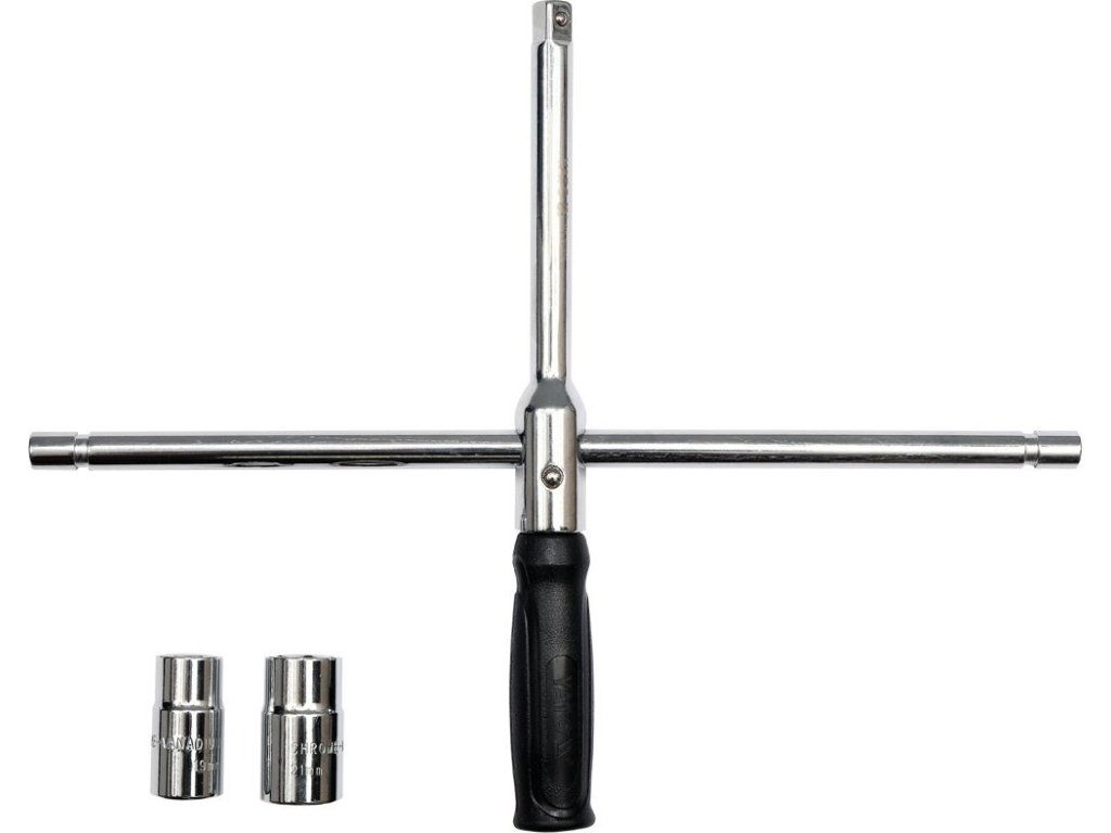 Sada je vyrobena z vysoce kvalitní CrV oceli. Obsah balení je samotný klíč s ergonomicky tvarovanou rukojetí a ramenem s jehož pomocí vytvoříme potřebnou páku (křížový klíč) a samotné ořechy velikosti 17, 19, 21, 22 mm, vše navíc uložené k pouzdře.
