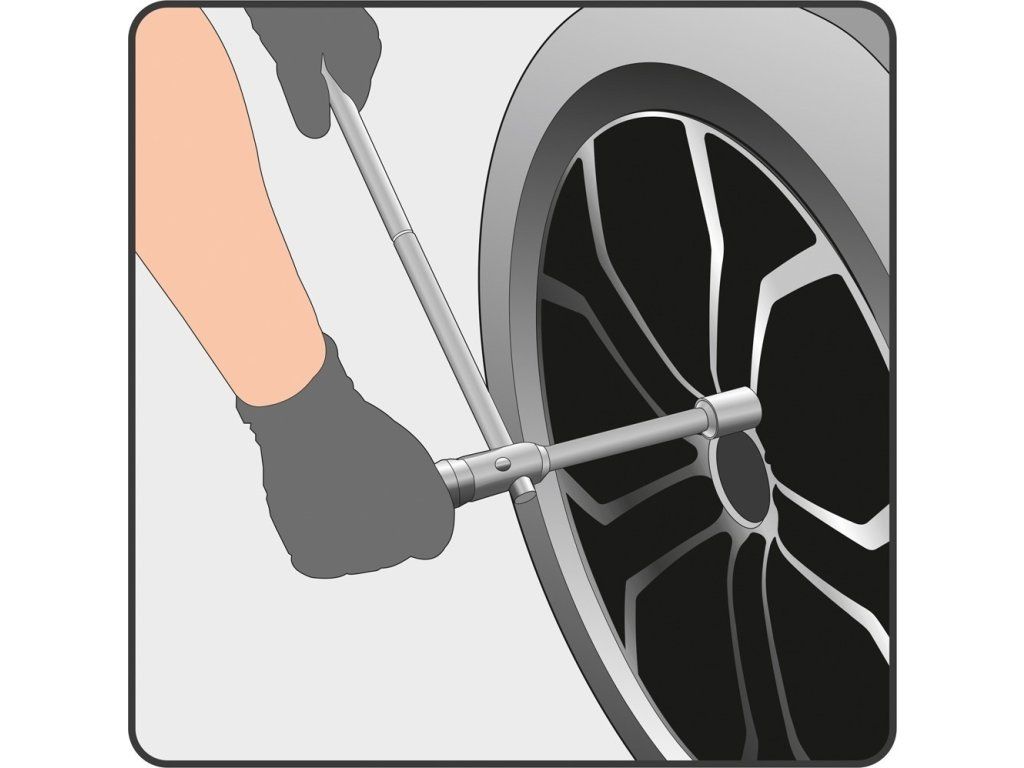 Skládací křížový klíč na kola vhodný jako výbava vozu. Zajišťuje pohodlnější výměnu kol.