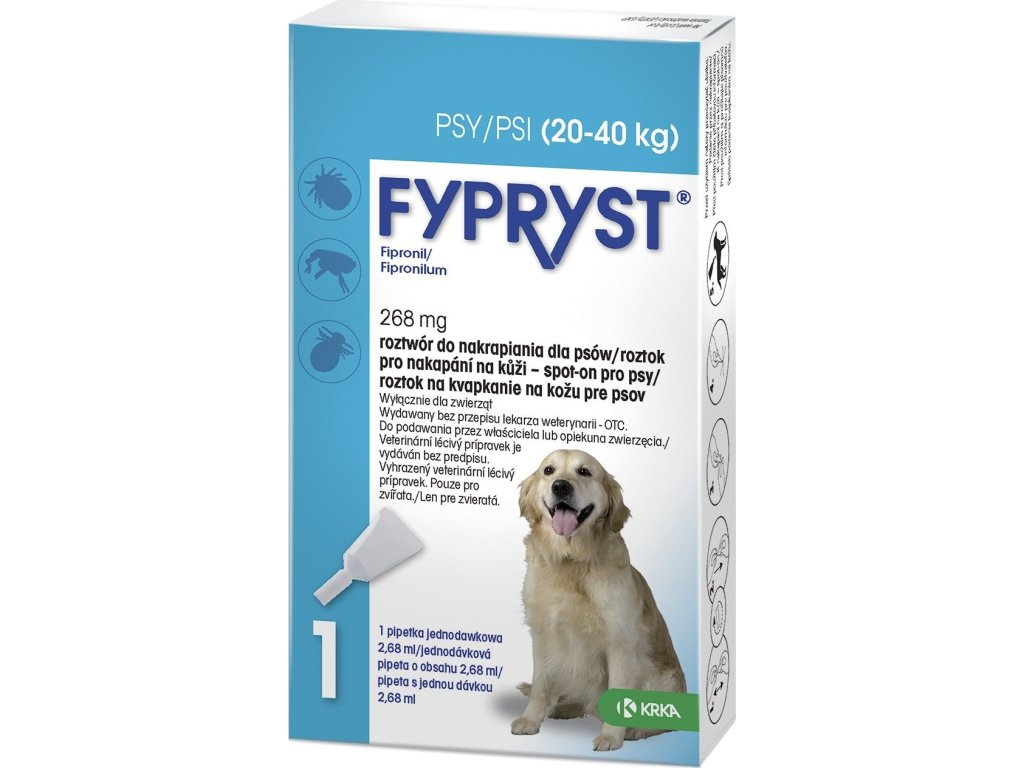 K léčbě a prevenci napadení blechami, klíšťaty a všenkami u psů o hmotnosti 20 - 40 kg (velké rasy psů).Kromě již zmíněného je přípravek Fypryst ideální jako léčba a kontrola alergie na bleší kousnutí. Nepoužívejte u štěňat mladších 8 týdnů nebo vážících pod 2kg. Dále nepoužívejte pro kočky, u kterých hrozí předávkování. Vyhněte se kontaktu se sliznicí zvířete.