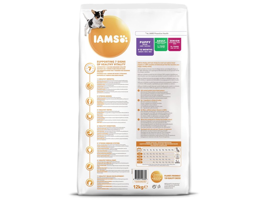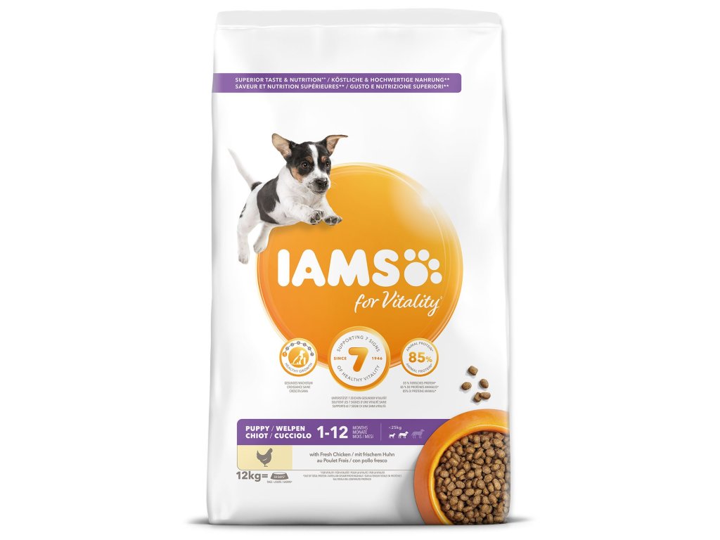Krmivo IAMS for Vitality pro štěňata malých a středních plemen je 100% kompletní a vyvážené odborníky sestavené krmivo, které bude vašemu štěněti svědčit. Naše nová a vylepšená receptura pro štěňata s čerstvým kuřecím masem je založena na kvalitních živočišných bílkovinách, které byly pečlivě vybrány, aby podporovaly sedm znaků zdravé vitality štěněte. Aby byla štěňata zdravá, aktivní a plná energie, obsahují naše lahodné receptury až 85 % živočišných bílkovin z kuřecího masa (z celkového obsahu bílkovin).
