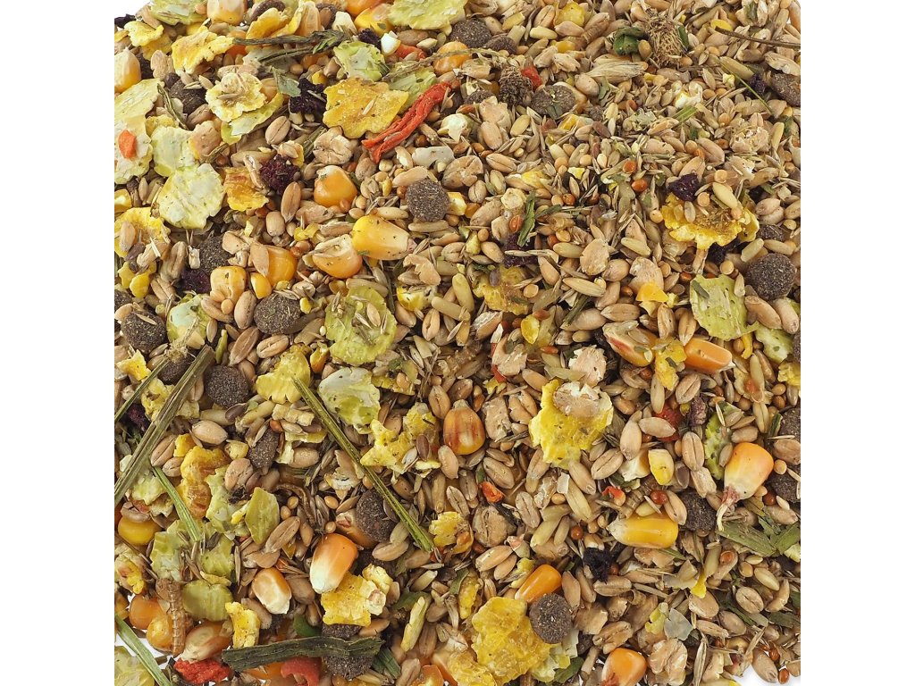 Složení: kukuřice 17 %, pšenice, kukuřičné vločky, pšeničné vločky, proso mana 8 %, hrachové vločky 8 %, oves, proso la plata, semena kanárských trav, semena travin, maso (sušené kuřecí, sušené hovězí 0,9 %, sušené ryby), extrudovaná kukuřičná mouka, zelenina (sušená mrkev, sušená červená řepa 1 %), lněné semeno, špalda, sušený jitrocel 2 %, rýže, sušení mouční červi 0,5 %.
