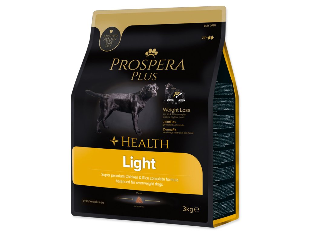PROSPERA PLUS Light je superpremiové krmivo, s recepturou vhodnou pro dospělé psy trpící nadváhou nebo psy s menší aktivitou. Základem receptury je kvalitní lehce stravitelné kuřecí maso s nízkým obsahem tuku. Dalšími důležitými složkami krmiva je komplex 3 vláknin (jablečné, řepné a z jitrocele), které napomáhají správné regulaci váhy psů. Krmivo je obohaceno o rybí tuk (omega 3 mastné kyseliny), který zlepšuje zdravou srst a kůži. Chondroprotektiva glukosamin a chondroitin pomáhají posilovat a stabilizovat kosti a klouby.