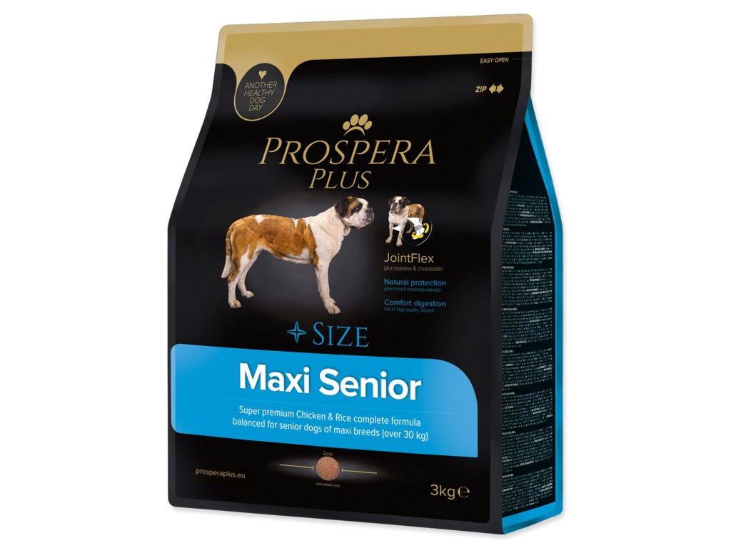PROSPERA PLUS Maxi Senior je superpremiové krmivo, které je přizpůsobeno tak aby splňovalo měnící se nutriční a fyziologické požadavky starších psů velkých a obřích plemen. Chondroprotektiva glukosamin a chondroitin pomáhají posilovat a stabilizovat kosti a klouby. Krmivo je bohaté na vysoce kvalitní a lehce stravitelné kuřecí maso obohacená o psyllium, které podporuje správný metabolismus tuků a pomáhá udržovat správnou hladinu cholesterolu. Ingredience obsažené v receptuře, fruktooligosacharidy a extrakt z kvasnic, posilují imunitu vašeho psa. Přírodní Omega 3 mastné kyseliny z rybího tuku společně s pupalkovým olejem zase přispívají ke zdravé srsti a krásné kůži.