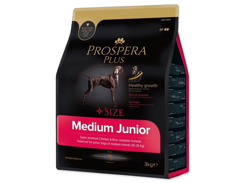 Máte štěně středního plemene, které bude mít v dospělosti 10-30 kg? PROSPERA PLUS Medium Junior je superpremiové krmivo určené právě pro štěňata a mladé psy středních plemen. Vyvážené minerály společně s vitamíny zaručují správný a zdravý růst všech štěňat středních plemen. Funkční ingredience obsažené v receptuře (rybí tuk, fruktooligosacharidy) posilují imunitu a podporují zdravou srst a kůži vašich pejsků.