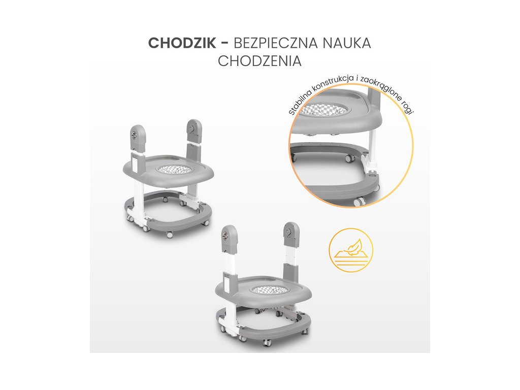 Funkcja chodzika wspiera naukę samodzielnego poruszania się, pomagając dziecku stawiać pierwsze kroki w bezpieczny sposób. Stabilna konstrukcja i zaokrąglone rogi chronią malucha przed urazami podczas zabawy, a regulacja wysokości pozwala dopasować chodzik do wzrostu dziecka, zapewniając komfort na każdym etapie nauki chodzenia. Dodatkowo, wbudowana tacka umożliwia zabawę, naukę lub podawanie przekąsek w wygodny i bezpieczny sposób.