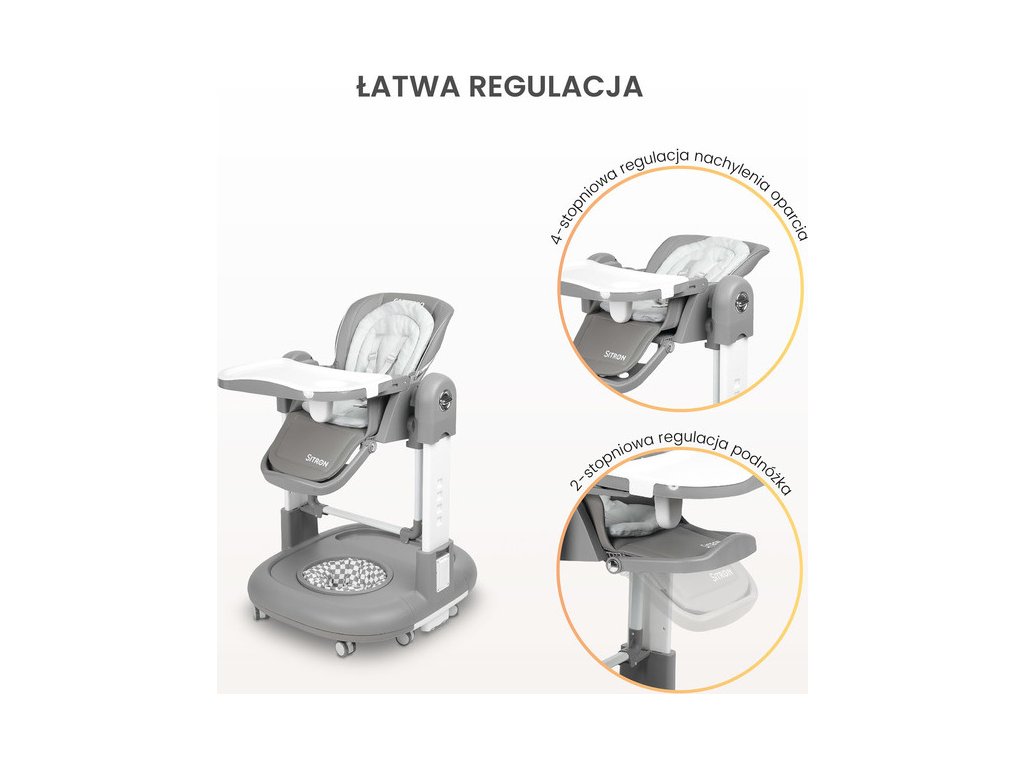 Krzesełko zostało zaprojektowane tak, aby dopasować się do potrzeb dziecka na każdym etapie rozwoju. Oparcie można ustawić w 4 pozycjach, dzięki czemu sprawdzi się zarówno podczas karmienia, jak i odpoczynku. 5-stopniowa regulacja wysokości siedziska umożliwia idealne dopasowanie do stołu, a regulacja odległości tacki zapewnia dziecku komfort i swobodę podczas posiłków.