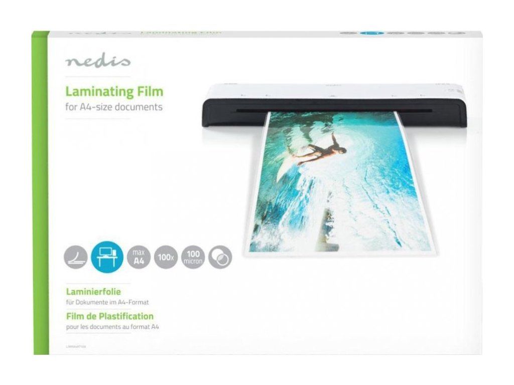 Nedis laminovací fólie A4Laminovací fólie chrání dokumenty proti vlhku, prachu a znečištění, a tím prodlouží jejich životnost. Navíc zabrání případnému zásahu do obsahu dokumentů. Laminování fotografií zlepší také jejich barevnost. Fólie o tloušťce 100 mikronů ve formátu A4 jsou určené k laminaci poznámek, dokumentů, fotografií, kreseb a diplomů.