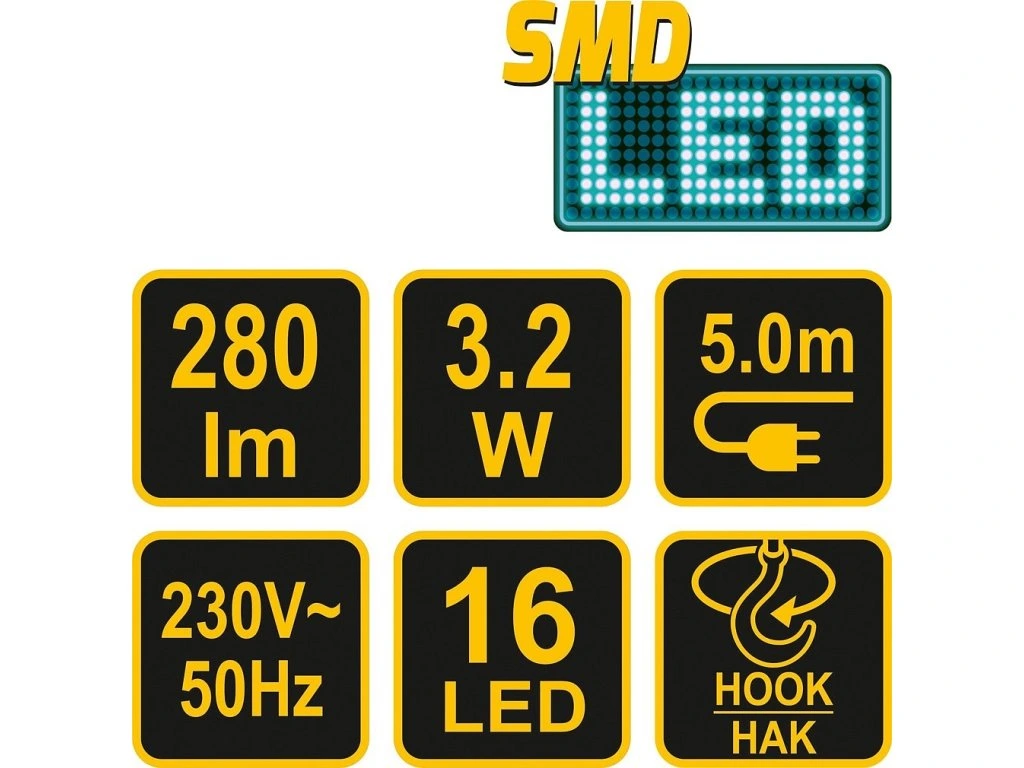 Montážní lampa s napájením ze zásuvky 230 V, osazená 16x SMD LED o výkonu 3,2 W vyzařující světelný tok 280 lm v barvě chromatičnosti 4000K.