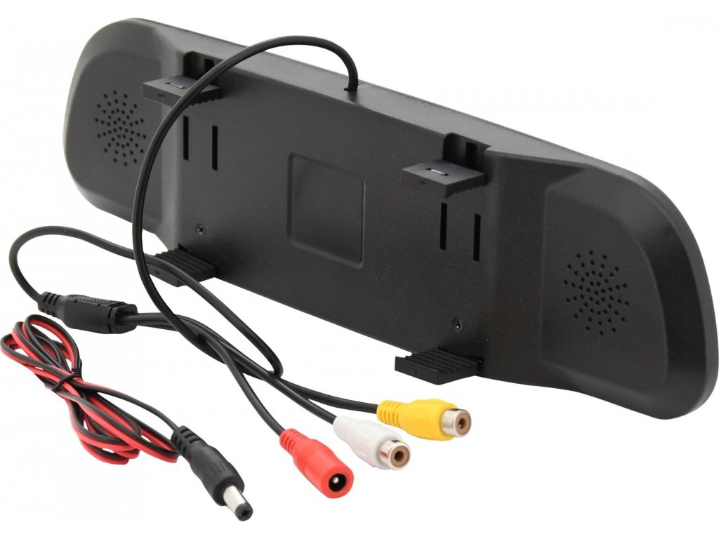 Přídavné zrcátko se zabudovaným LCD displejem, ideální pro použití s parkovací kamerou i k přehrávání NTSC/PAL videí z jakéhokoliv přehrávače s výstupním Cinch (RCA) kabelem.