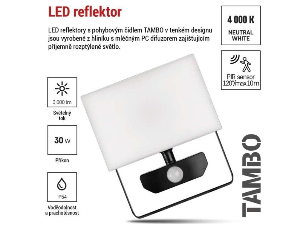 LED reflektor TAMBO se senzorem pohybu, 30 W, 3000 lm, černý
