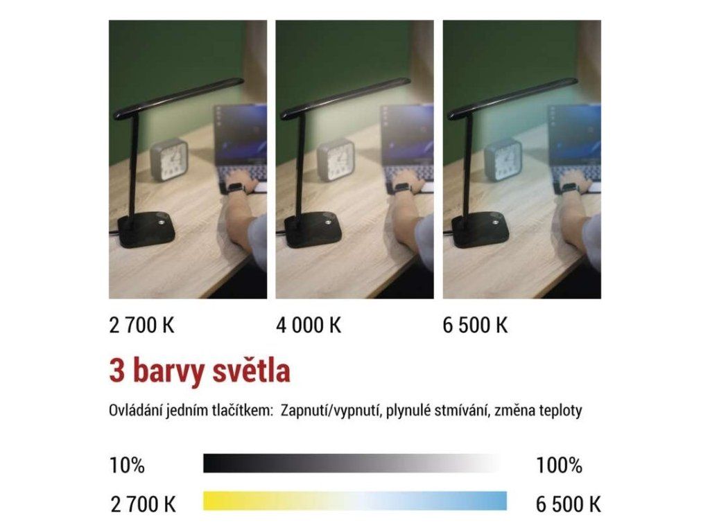 Na ovládacím panelu si můžete zvolit intenzitu a odstín svícení.Na výběr je z více barev.