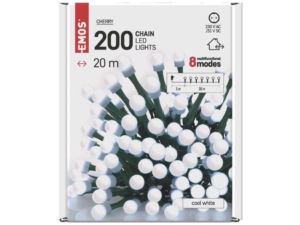 LED vánoční cherry řetěz – kuličky, 20 m, venkovní i vnitřní, studená bílá, programy