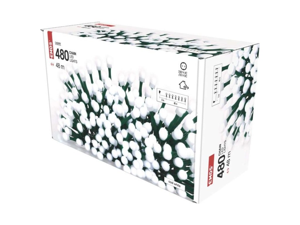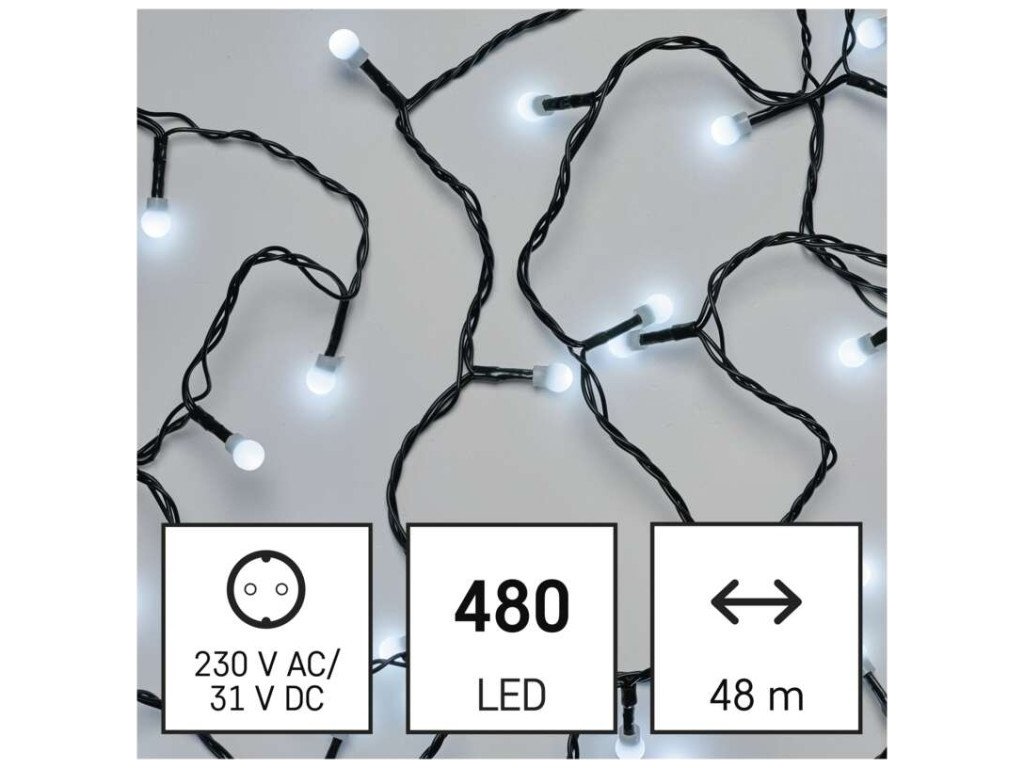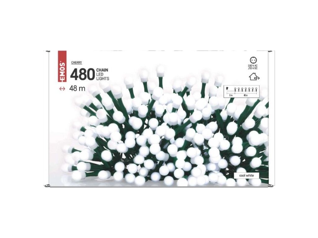 LED vánoční cherry řetěz – kuličky, 48 m, venkovní i vnitřní, studená bílá, časovač