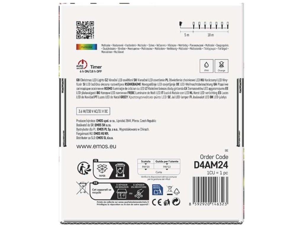 LED vánoční řetěz, 18 m, venkovní i vnitřní, multicolor, programy, časovač