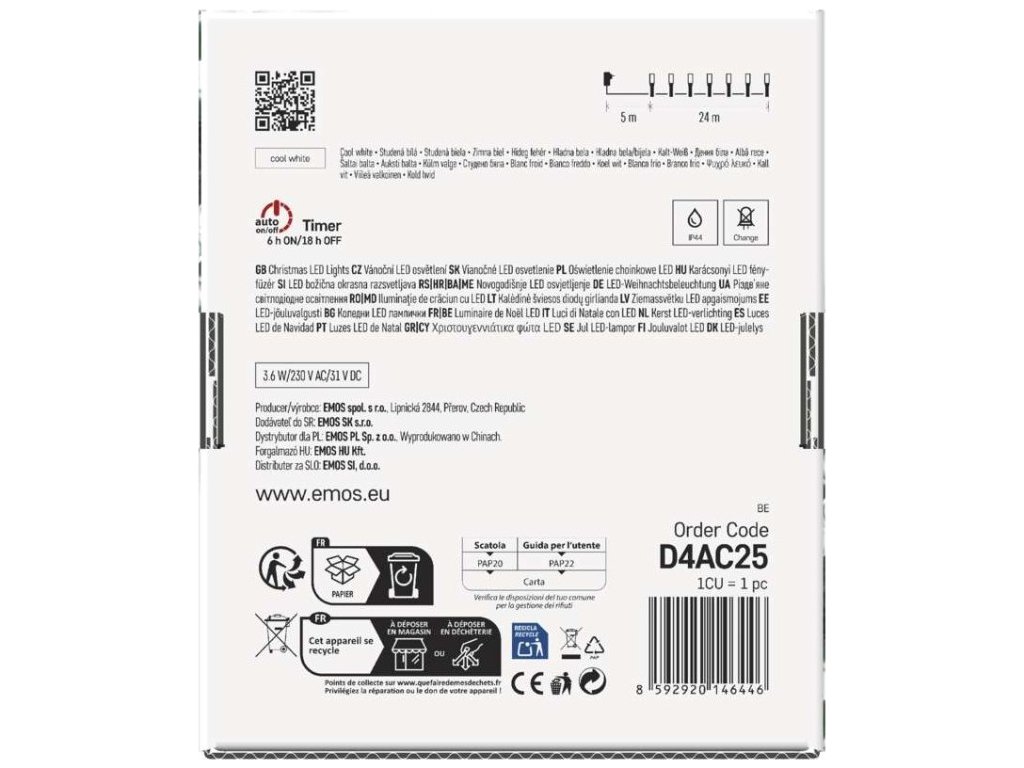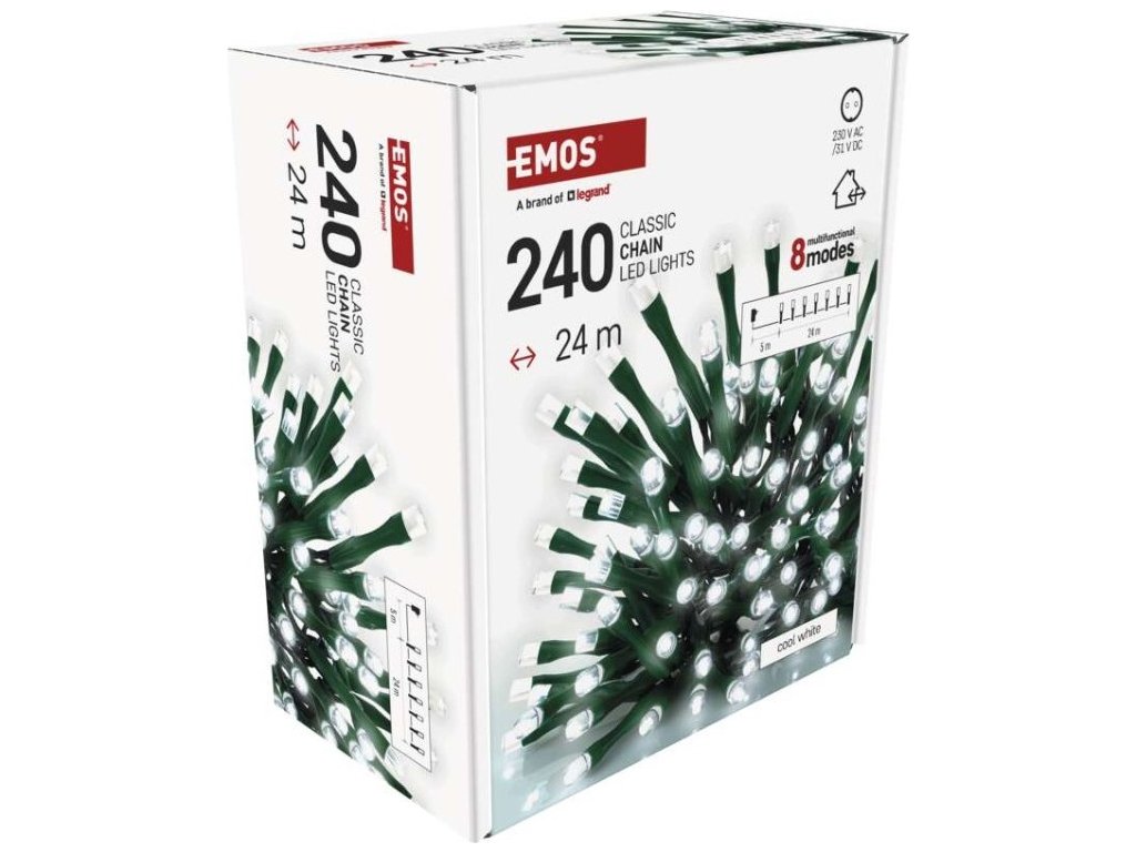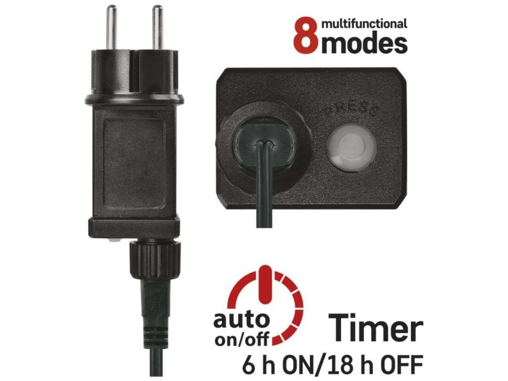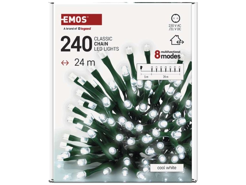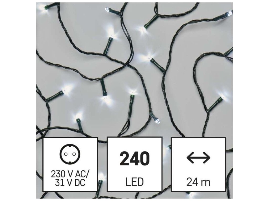 LED vánoční řetěz, 24 m, venkovní i vnitřní, studená bílá, programy, časovač
