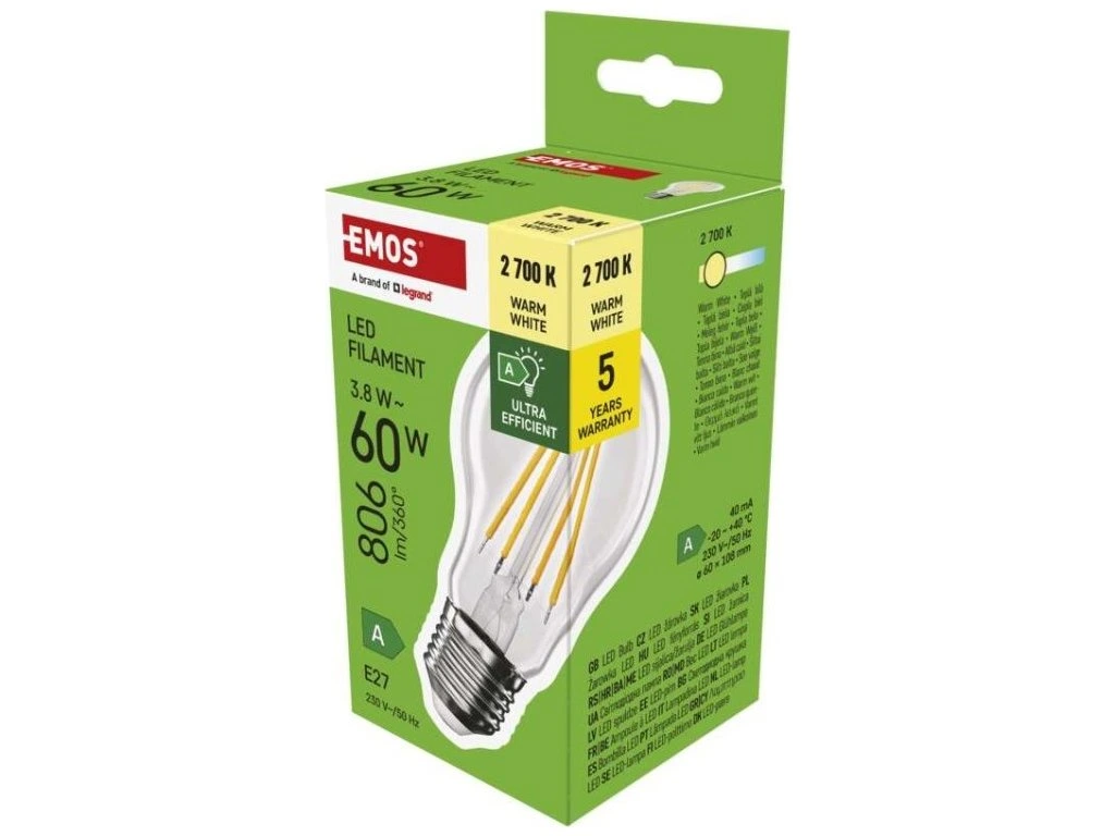 LED žárovka Filament A60 A CLASS / E27 / 3,8 W (60 W) / 806 lm / teplá bílá