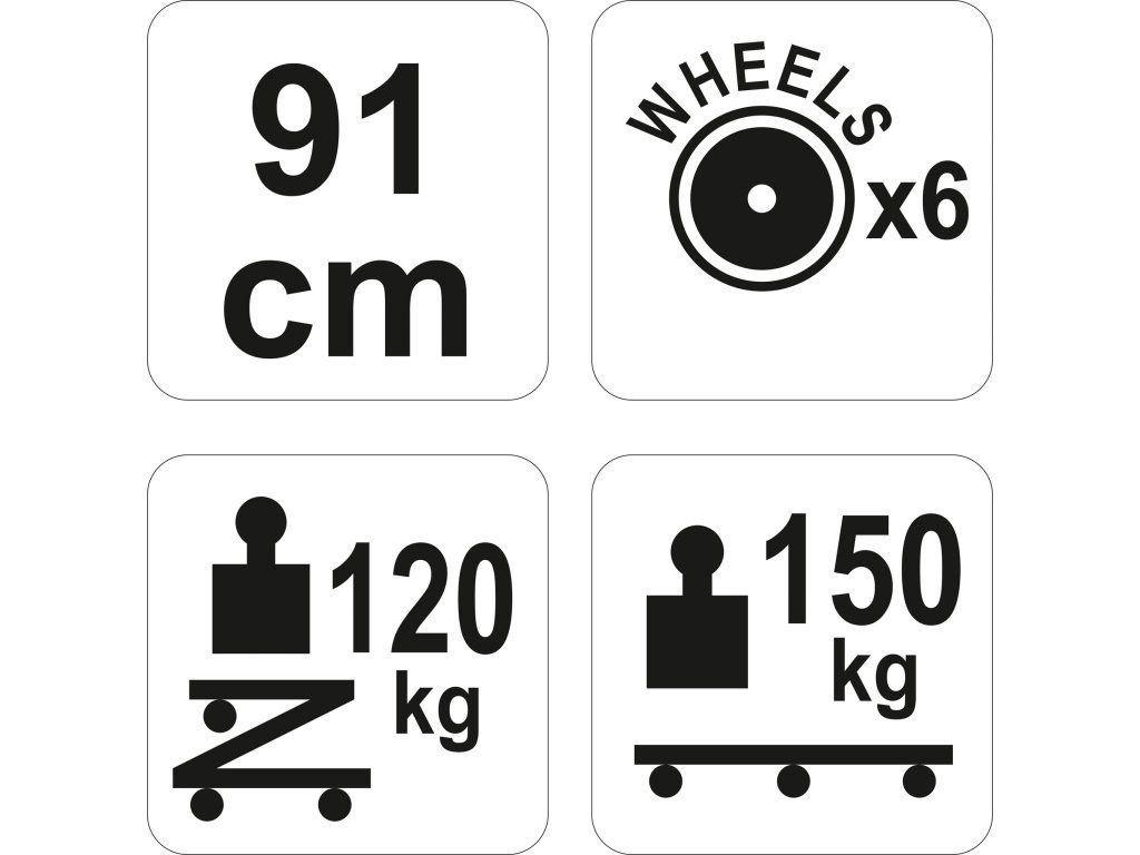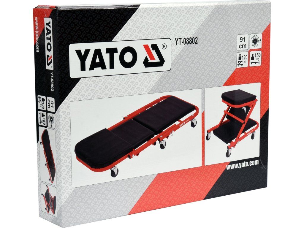Lehátko má nosnost 150 kg a délku 91 cm. Tahem lze lehátko přeměnit na praktickou a pohodlnou dílenskou stoličku s nosností 120 kg.