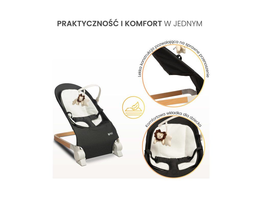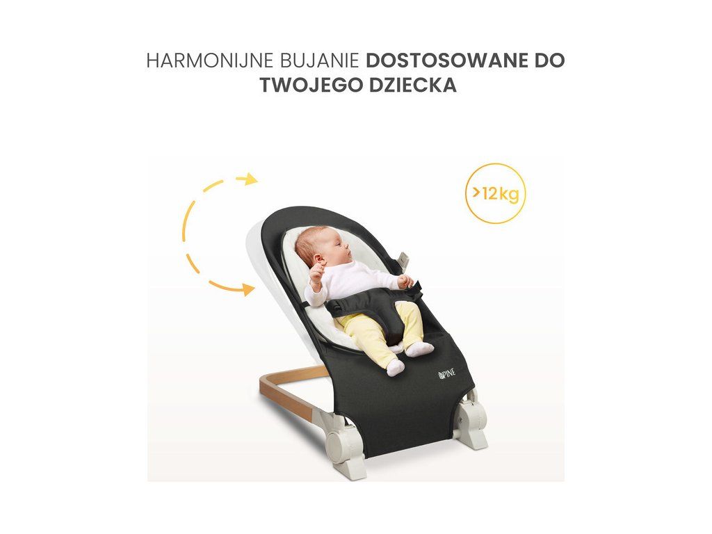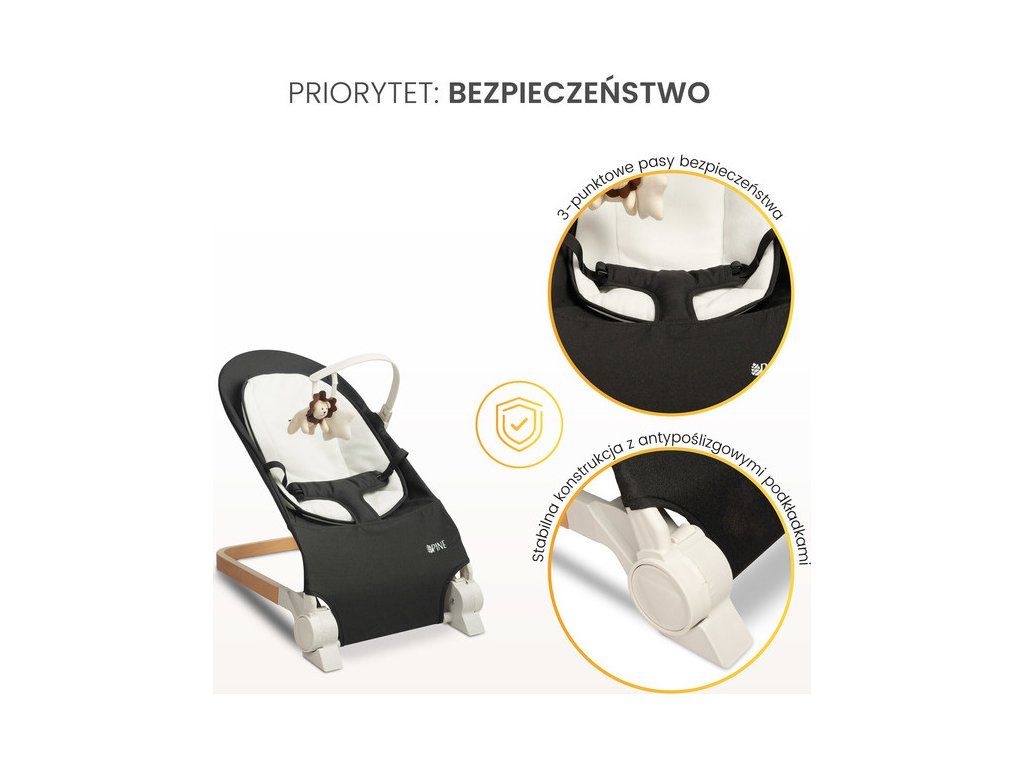 • zaawansowane bezpieczeństwo - z myślą o bezpieczeństwie najmłodszych użytkowników, PINE został wyposażony w pasy bezpieczeństwa, które zapobiegają przed wypadnięciem malucha z leżaczka;