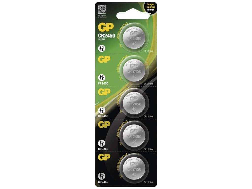 GP 3 V CR2450 5 ksKnoflíkové baterie, vhodné pro každodenní použití v různých malých elektrických zařízeních.
