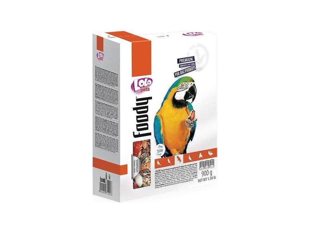 LOLO Foody kompletní krmivo pro velké papoušky 900 g krabička