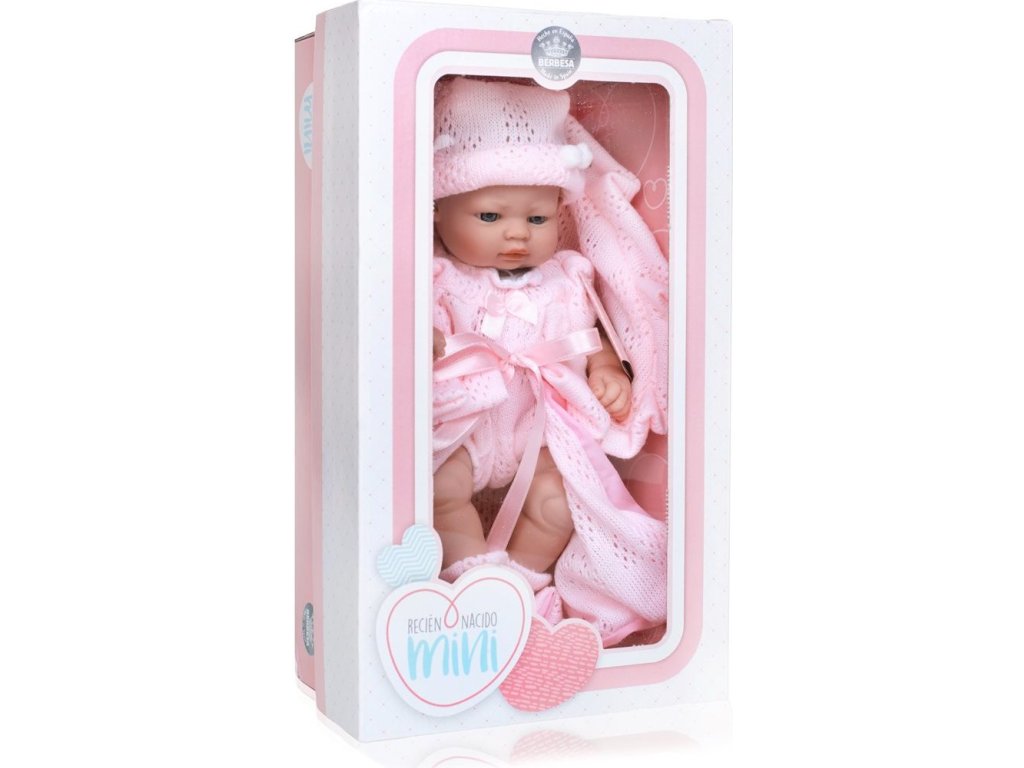 Luxusní španělská dětská panenka-miminko Berbesa Valentina. Panenka má vinylové tělíčko, ručičky i nožičky. Valentina má milou tvářičku, která vypadá jako opravdové miminko. Faldíky na ručičkách, nožičkách a bříšku ještě více připomínají novorozence. Panenka má krásná modrá kukadla, růžové rtíky, ručičky a nožičky jsou pohyblivé v kloubech. Součástí je roztomilý pletený růžový overal s mašličkou, pletená čepička, ponožky a krásná pletená zavinovačka. Obleček se dá sundat. Tělíčko miminka má jemnou vůni po vanilce. Délka panenky je cca 28 cm. Vhodné pro děti od 3 let. Při výrobě jsou používány výhradně kvalitní materiály.