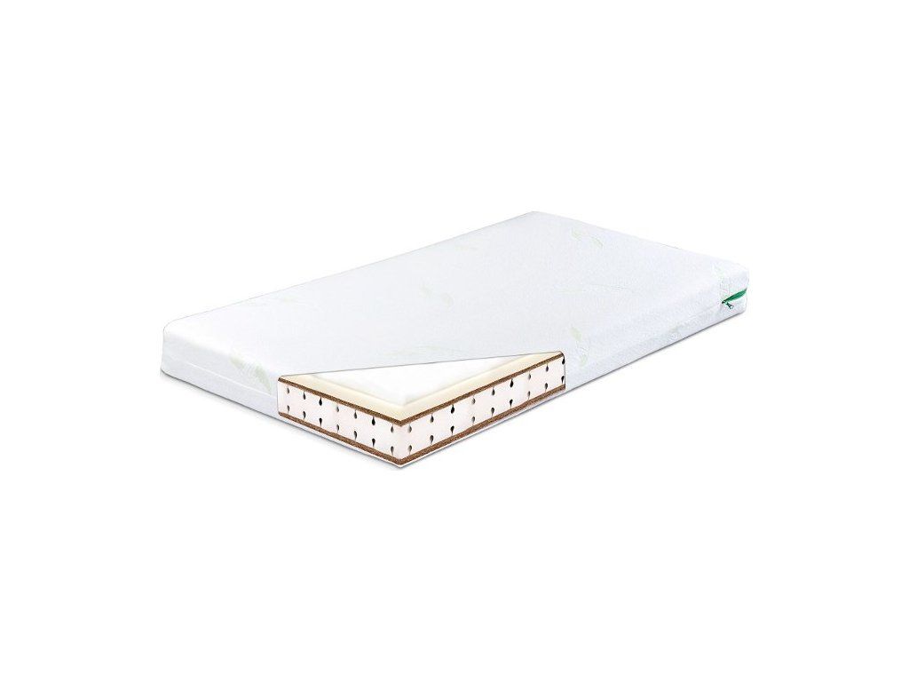 Dětská molitanová matrace Sensillo Memory s dvojitou vrstvou kokosového vlákna, termoelastickou pěnou a snímatelným potahem s Aloe Vera, který lze prát v pračce na 40°C.