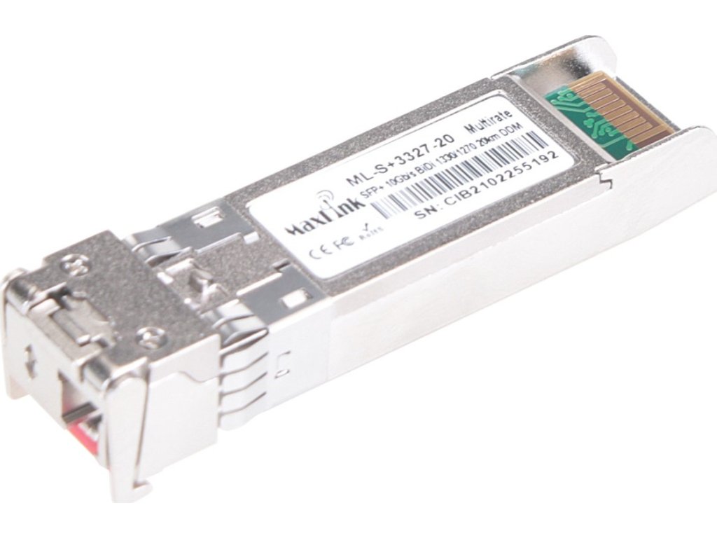 ML-S+3327-20 je singlemode 10G SFP+ WDM modul pro přenos dat pomocí jednoho vlákna s jedním LC konektorem. Vlnová délka (Tx/Rx) tohoto modulu je 1330/1270nm a je vhodný pro spojení až na vzdálenost 20km. Modul je "cisco compatibile" a je kompatibilní téměř se všemi aktivními prvky. LC konektory v SFP modulu mají broušení typu UPC.