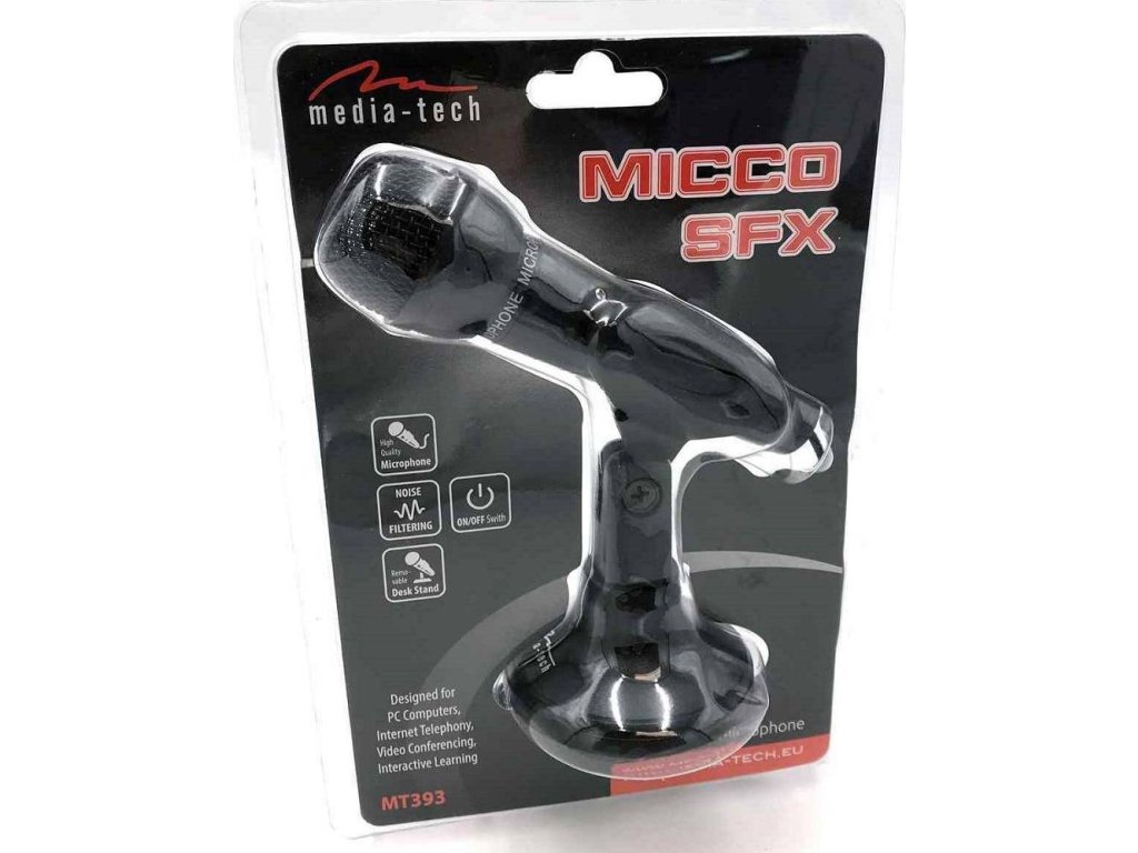 Vysoce kvalitní stolní mikrofon se stojánkem. Micco MT393 SFX je perfektní nástroj pro audio a video chaty, poskytuje extrémně vysokou kvalitu hlasu.