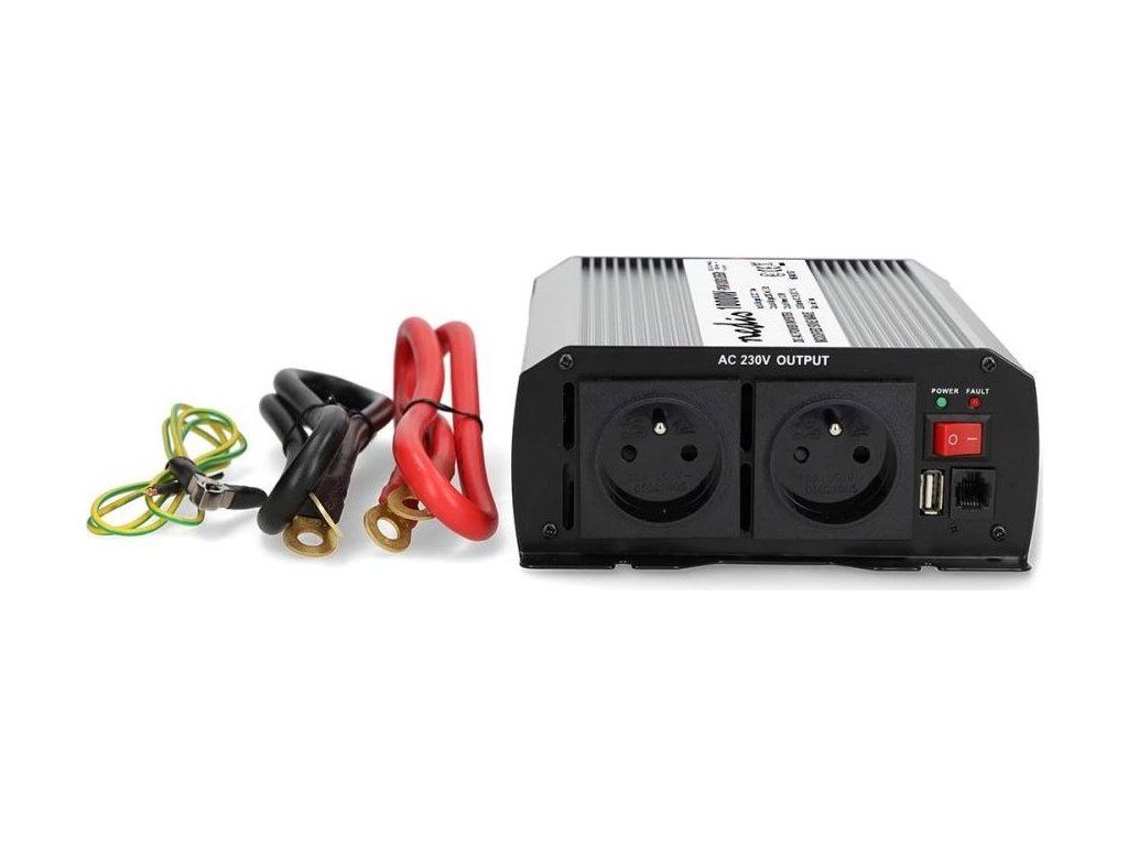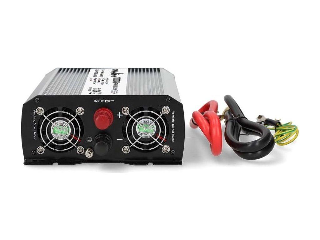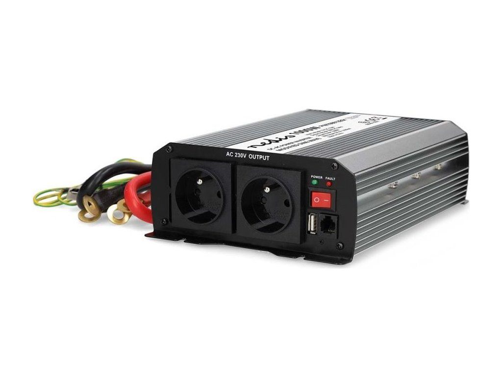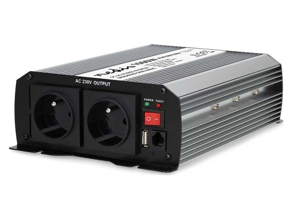 Měnič Modifikovaná sinusoida | Vstupní napětí: 12 V DC | Výstupní napájecí konektor(y): Type E (CEE 7/5) / USB-A | 230 V AC 50 Hz | 1000 W | Špičkový výstupní výkon: 2000 W | Svorkovnice | Stříbrná