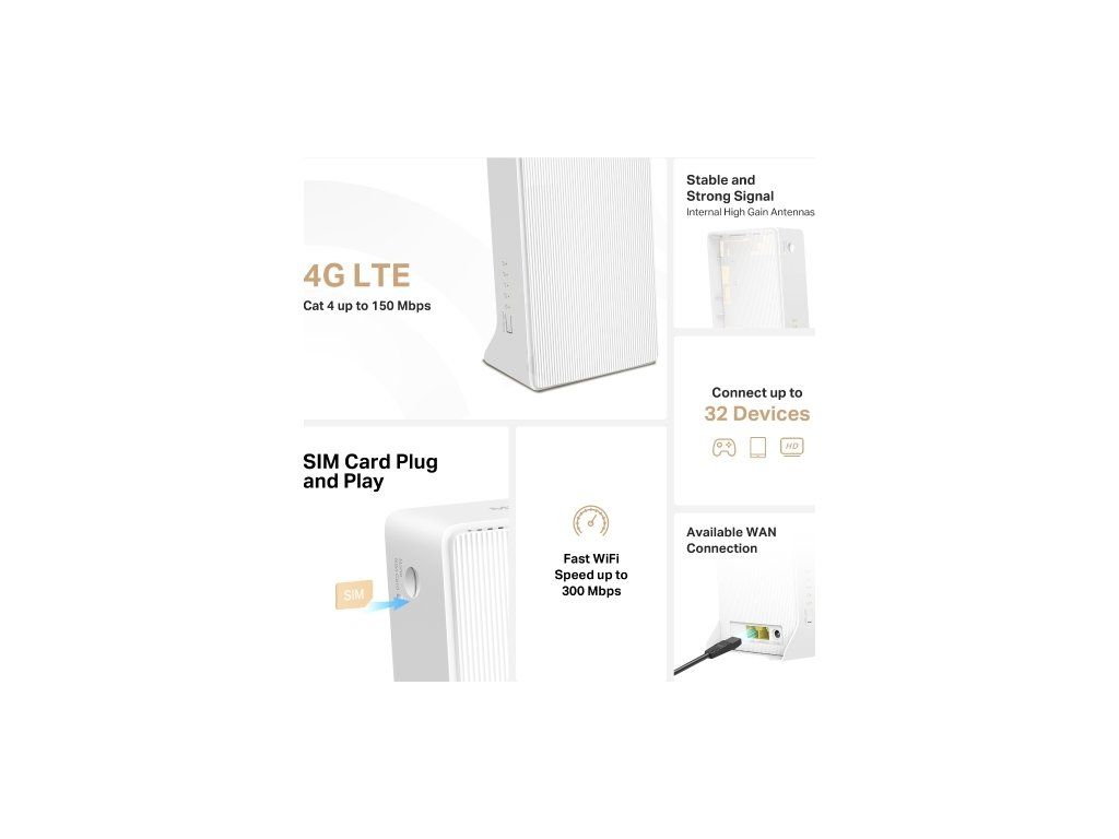 4G síť – Užijte si stahování rychlostí 4G LTE až 150 Mb/s. Zasuňte SIM kartu a hrajte – Žádné nastavení není potřeba, kompatibilita SIM karet je zajištěna lety testování. 300 Mb/s rychlá Wi-Fi – Vysoká rychlost WiFi až 300 Mb/s pro sdílení sítě. Současné připojení – Sdílení přístupu k internetu až s 32 Wi-Fi zařízeními. Režim Wi-Fi routeru – Připojte ethernetový kabel do portu LAN/WAN pro flexibilní přístup, pokud nemůžete získat 4G připojení.SPECIFIKACE