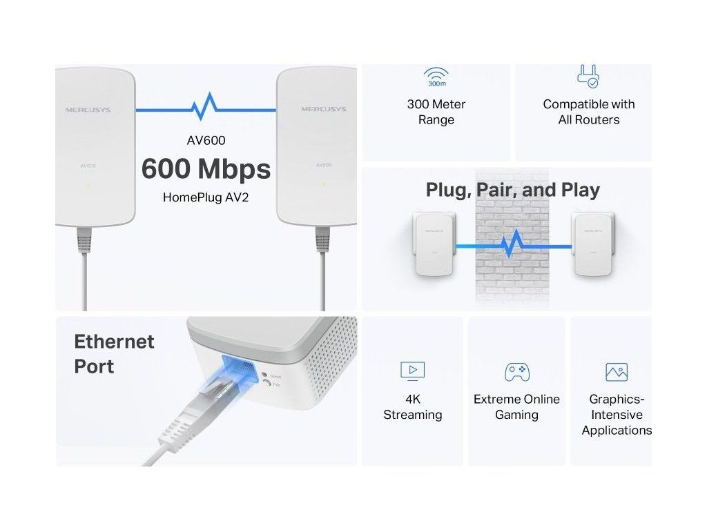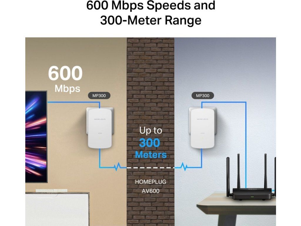 Sada Mercusys MP300 KIT obsahuje dva powerline adaptéry, které využívají stávající elektrickou instalaci v domácnosti k přenosu síťových dat. Technologie HomePlug AV2 zajišťuje stabilní a rychlé připojení s přenosovou rychlostí až 600 Mb/s na vzdálenost až 300 metrů po elektrickém vedení. Řešení je ideální pro místa, kde Wi-Fi signál nedosahuje nebo je rušen překážkami.