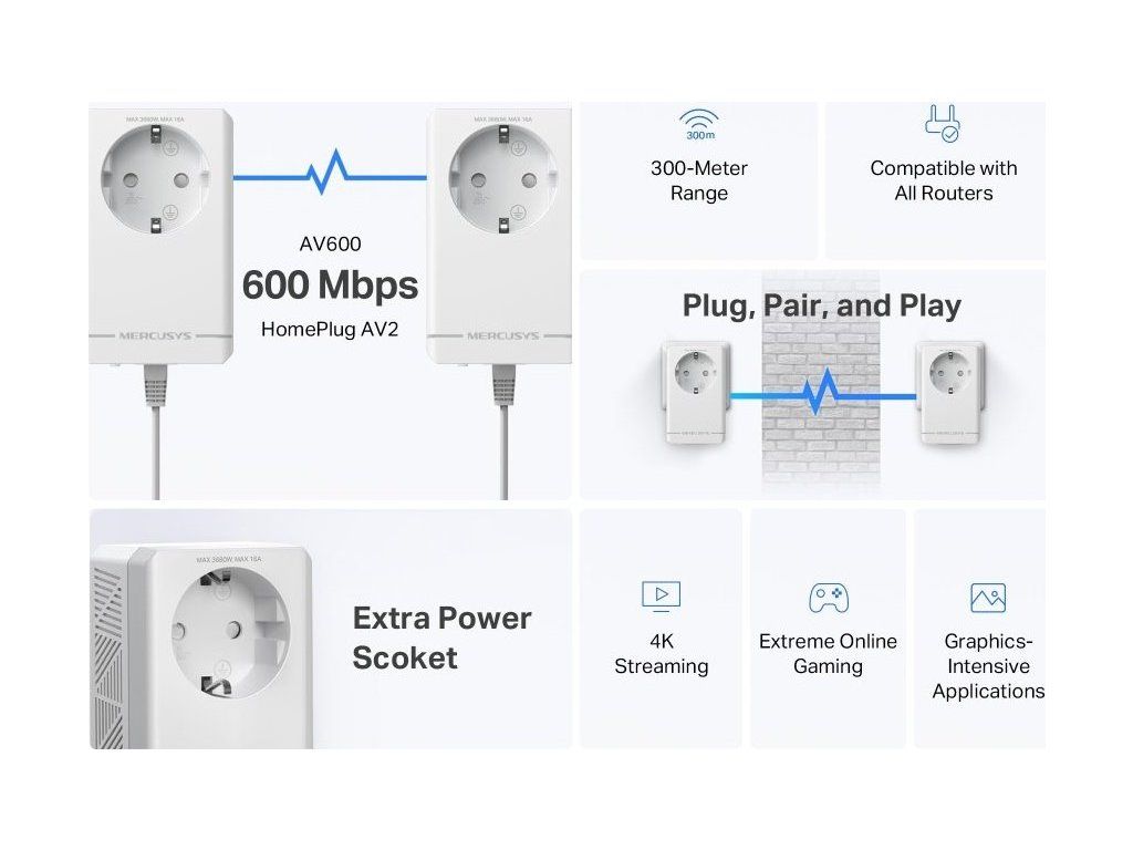 Adaptéry jsou kompatibilní se všemi typy routerů a lze je snadno kombinovat s dalšími powerline adaptéry Mercusys pro rozšíření pokrytí do více místností. Podporují standardy HomePlug AV2 i HomePlug AV.