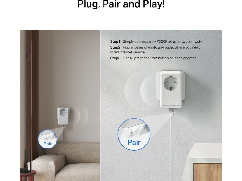 Každý adaptér je vybaven průchozí zásuvkou, takže po jeho zapojení neztrácíte elektrickou zásuvku. Instalace je maximálně jednoduchá – stačí zapojit jeden adaptér k routeru, druhý do zásuvky v požadované místnosti a stisknout párovací tlačítko. Automatický úsporný režim snižuje spotřebu energie až o 85 %, když nejsou adaptéry využívány.
