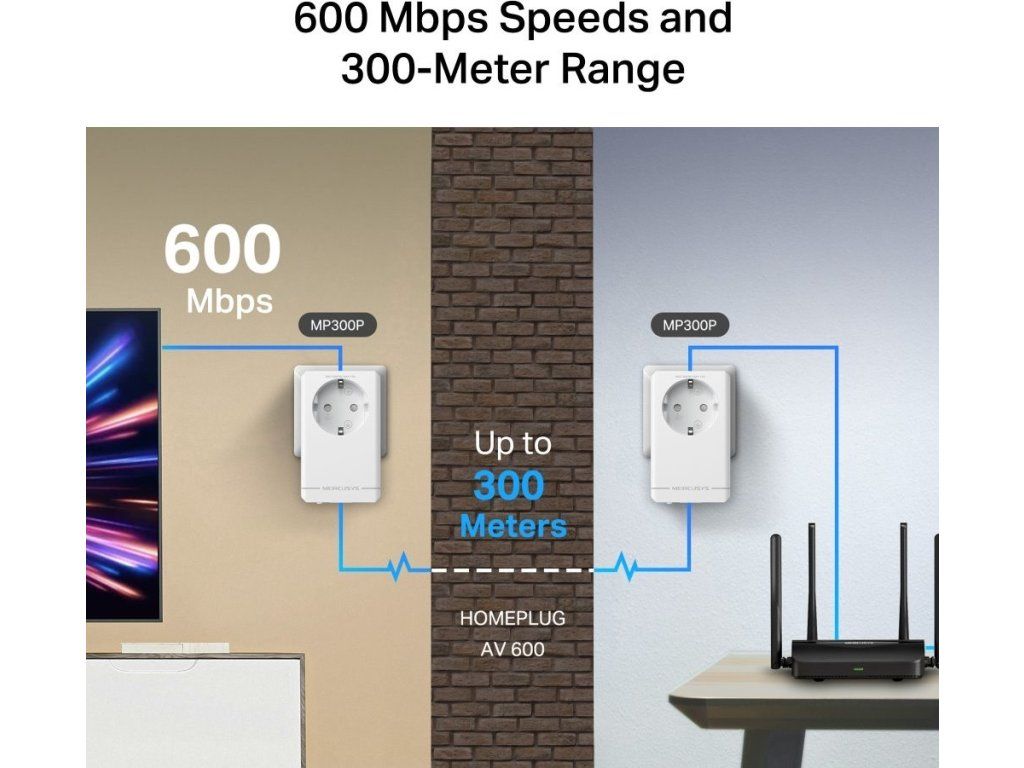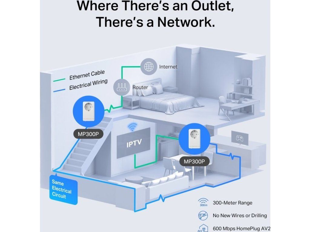 Sada MP300P KIT obsahuje dva powerline adaptéry, které využívají stávající elektrické rozvody v domácnosti k přenosu síťových dat. Technologie HomePlug AV2 zajišťuje stabilní přenos rychlostí až 600 Mb/s na vzdálenost až 300 metrů v rámci jednoho elektrického okruhu. Řešení je ideální pro 4K streaming, online hraní nebo přenos velkých souborů v místech, kde je Wi-Fi signál slabý nebo nestabilní.
