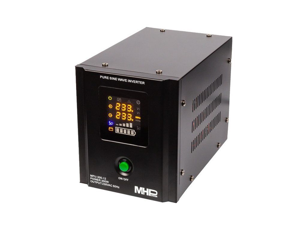 MHPower MPU-300-12Měnič napětí 12V/230V-300W s funkcí UPS. Připojte akumulátor a máte k dispozici kompletní záložní zdroj s automatickým přepnutím na záložní napájení.