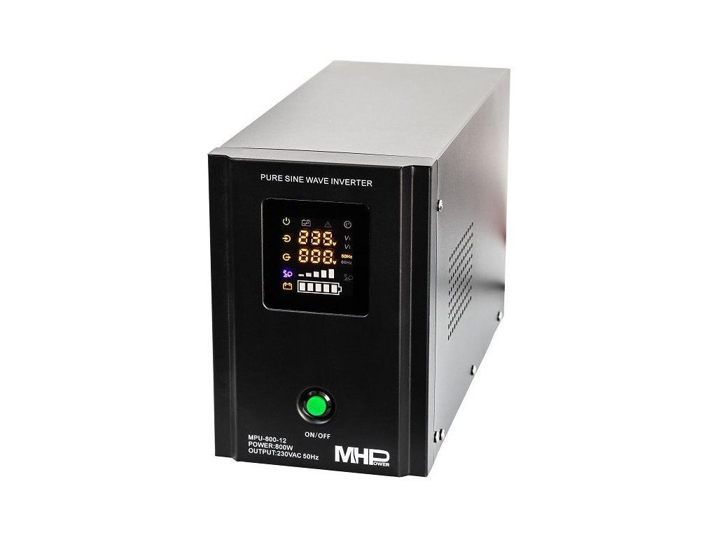 MHPower MPU-800-12Měnič napětí 12 V / 230 V s funkcí UPS a výkonem 800 W. Připojte akumulátor a máte k dispozici kompletní záložní zdroj s automatickým přepnutím na záložní napájení.