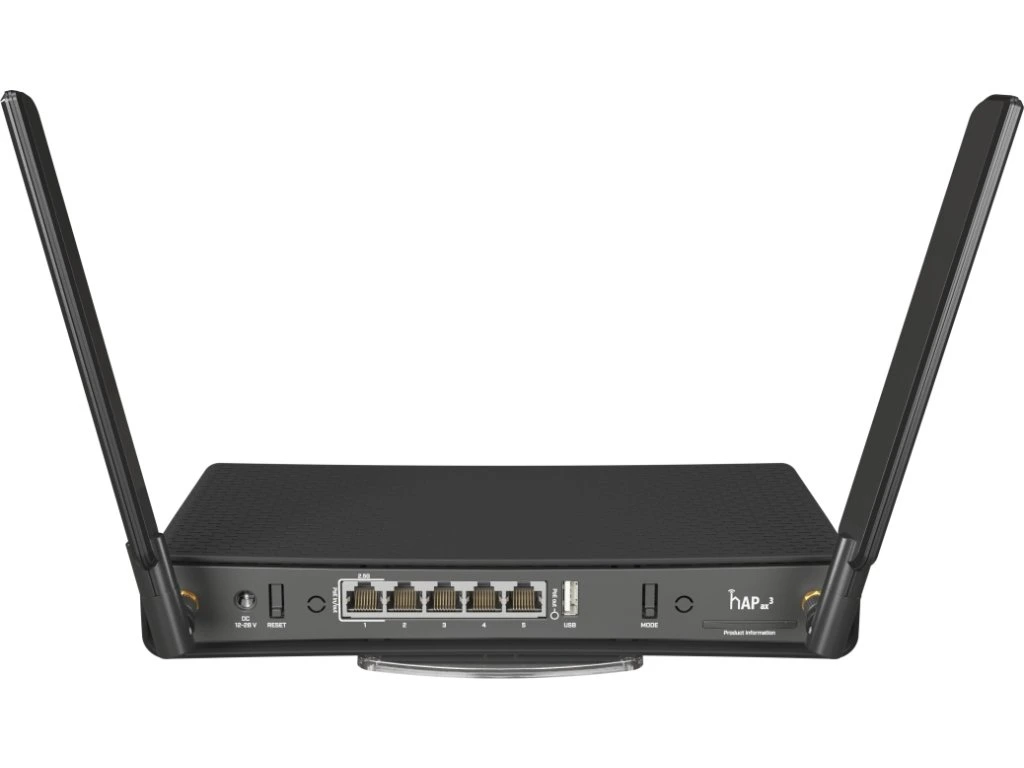 MikroTik hAP ax3MikroTik hAP ax3 je špičkový domácí Wi-Fi 6 přístupový bod AX (802.11ax + Wave 2) pracující v pásmech 2,4 a 5 GHz. Tento Wi-Fi router/AP disponuje čtyřmi GbE porty a jedním 2.5G portem s podporou PoE-in/out. Dvě externí antény se ziskem 3,3 a 5,5 dBi zajišťují stabilní bezdrátové připojení a optimální pokrytí. Další výhodou je i možnost připojení USB disku nebo např. 4G/LTE modemu přes USB konektor. První port navíc podporuje pasivní PoE vstup/výstup, díky čemuž může router napájet další externí zařízení (např. wAP jednotku). Router nabízí i vysoký výkon v podobě 4jádrového ARM procesoru Qualcomm IPQ-6010 pracujícího na frekvenci 1,8 GHz, 1 GB paměti RAM a 128 MB NAND paměti. Router je dodáván s operačním systémem RouterOS v7 L6.
