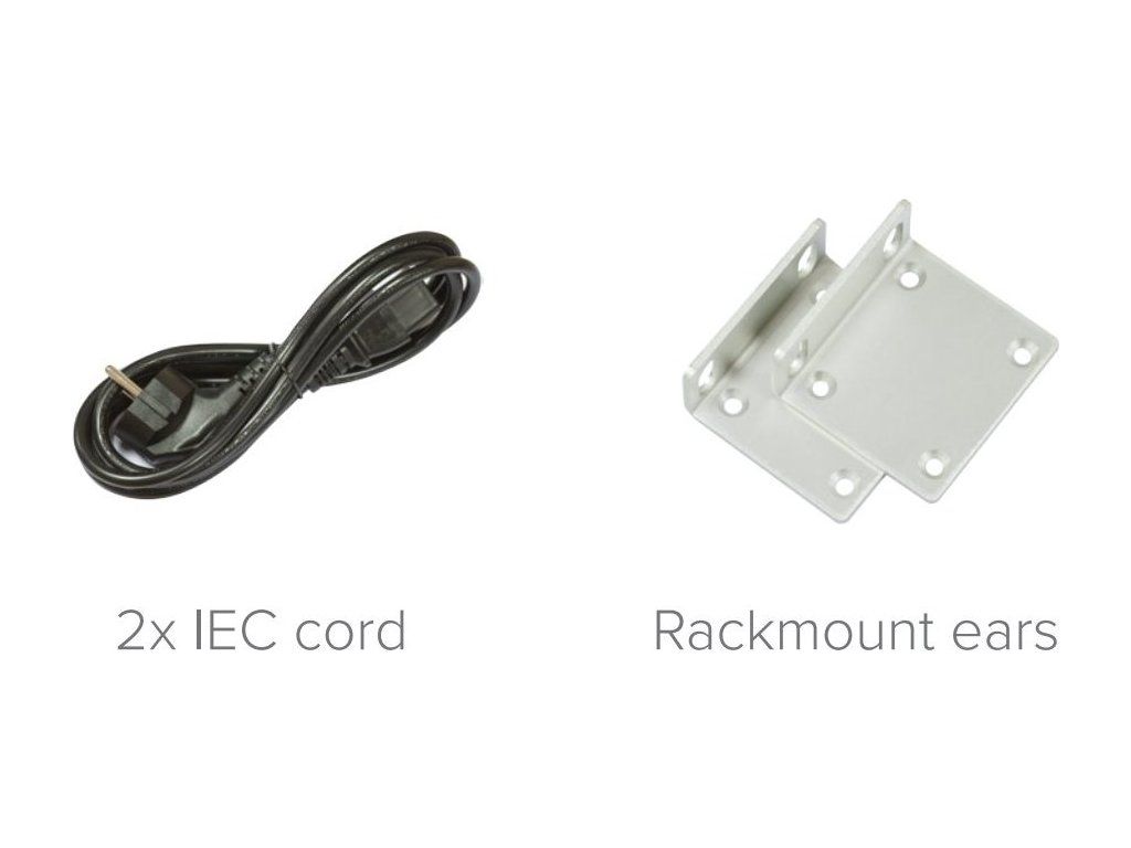 Součástí balení jsou dva držáky pro montáž do racku a dva napájecí kabely do sítě 230 V.