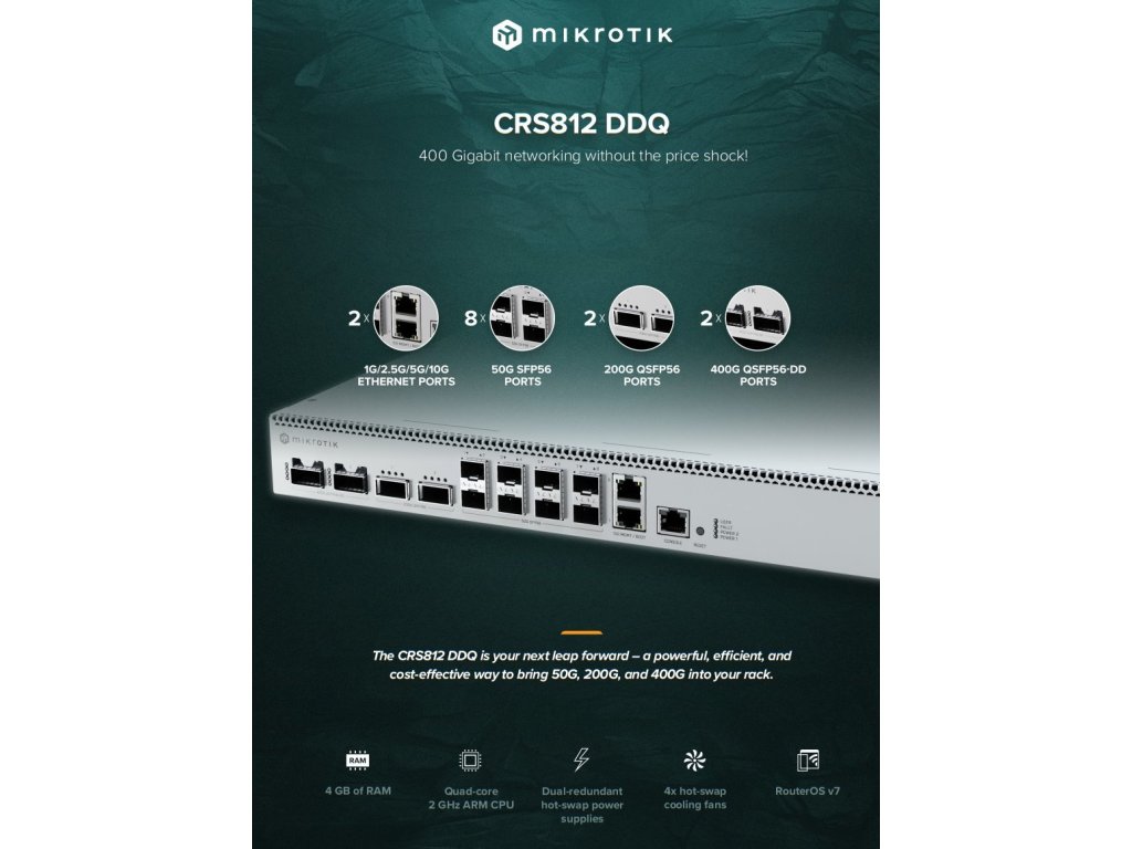 CRS812 DDQ představuje novou generaci síťových switchů s podporou 400 Gigabit Ethernet za dostupnou cenu. Vybaven moderním Marvell switch chipem 98DX7335 a výkonným quad-core ARM procesorem AL52400 s frekvencí 2 GHz, poskytuje pokročilé routing, switching a traffic management funkce známé z milionů RouterOS nasazení.