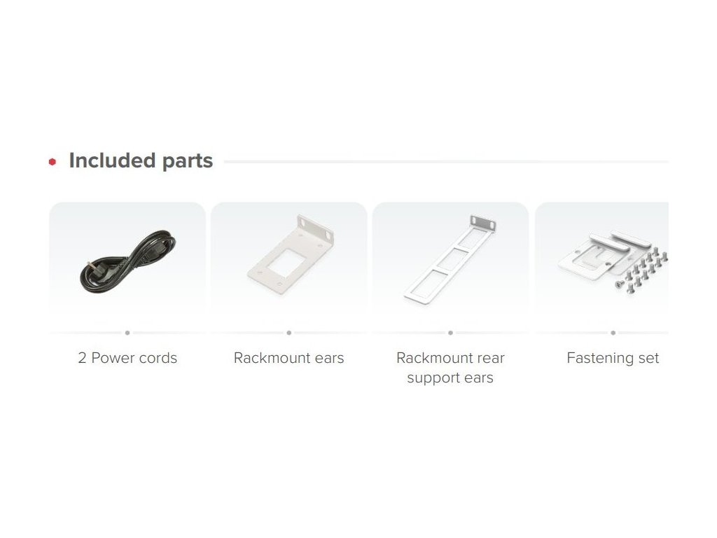 V balení naleznete 2× napájecí kabely, rackmount konzole, zadní podpory a kompletní montážní sadu pro instalaci do 19" racku.