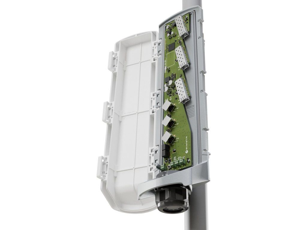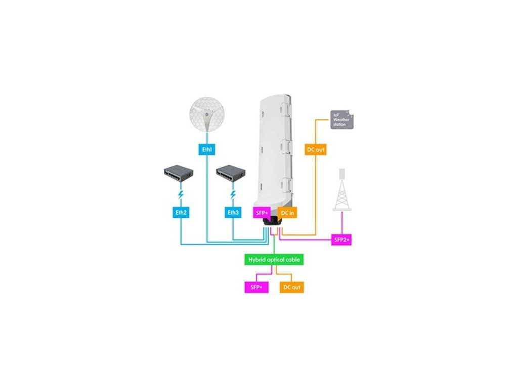 Řešení pro náročné venkovní instalace, kde je potřeba rozdělit data a napájení z jednoho hybridního kabelu na více zařízení. Switch GPERx6 kombinuje 3 Gigabit Ethernet porty s PoE funkcionalitou, 3 vysokorychlostní 10G SFP+ porty pro optické spoje a 3 DC výstupy pro napájení IoT zařízení nebo specializovaných přístrojů.